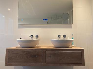 Dit stijlvolle en praktische badkamermeubel is volledig met de hand gemaakt van massief eikenhout. Het meubel heeft twee lades naast elkaar, wat zorgt voor veel opbergruimte zonder dat het meubel robuust oogt. Bovenop is ruimte voor één of twee opbouw waskommen, zoals op de foto — maar natuurlijk is dit helemaal naar wens aan te passen.