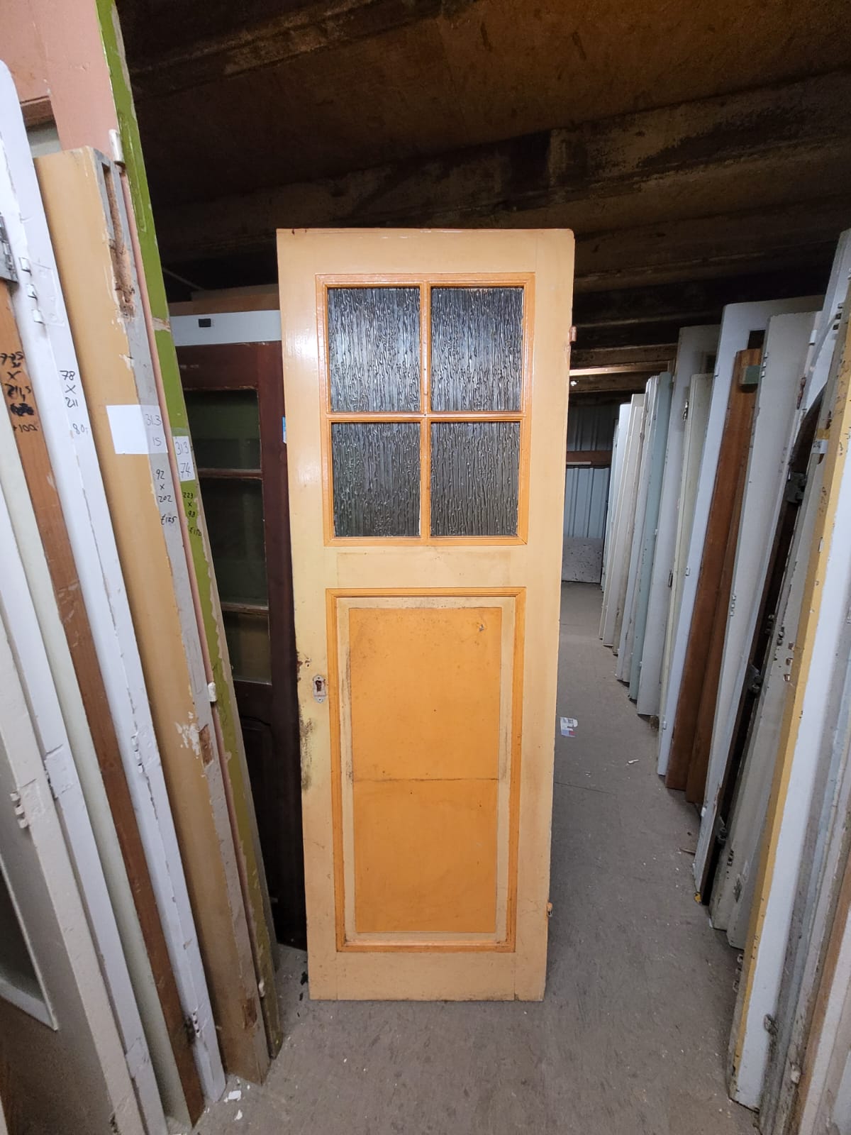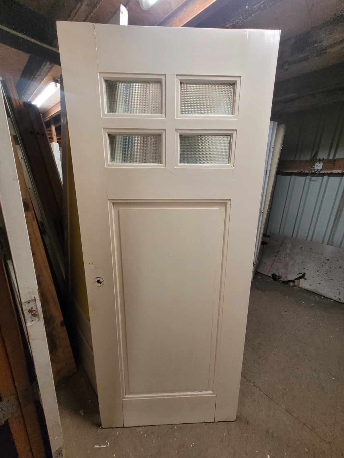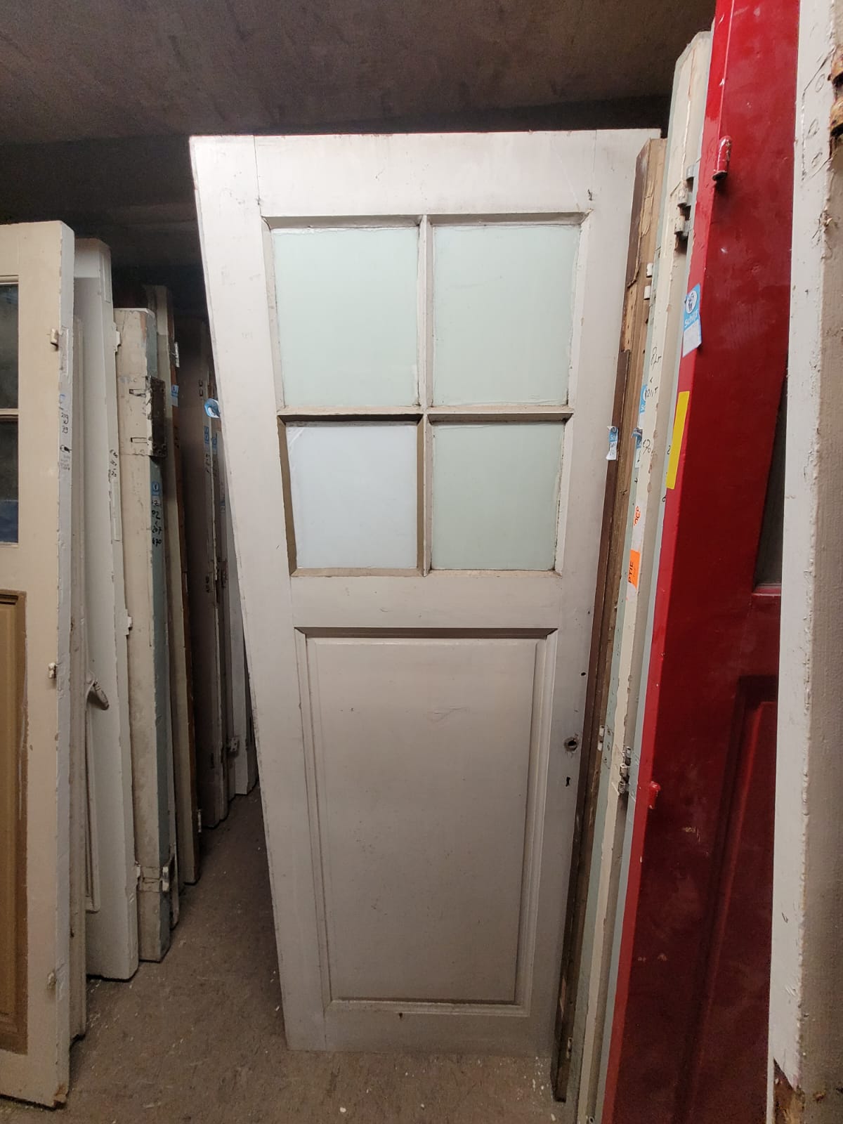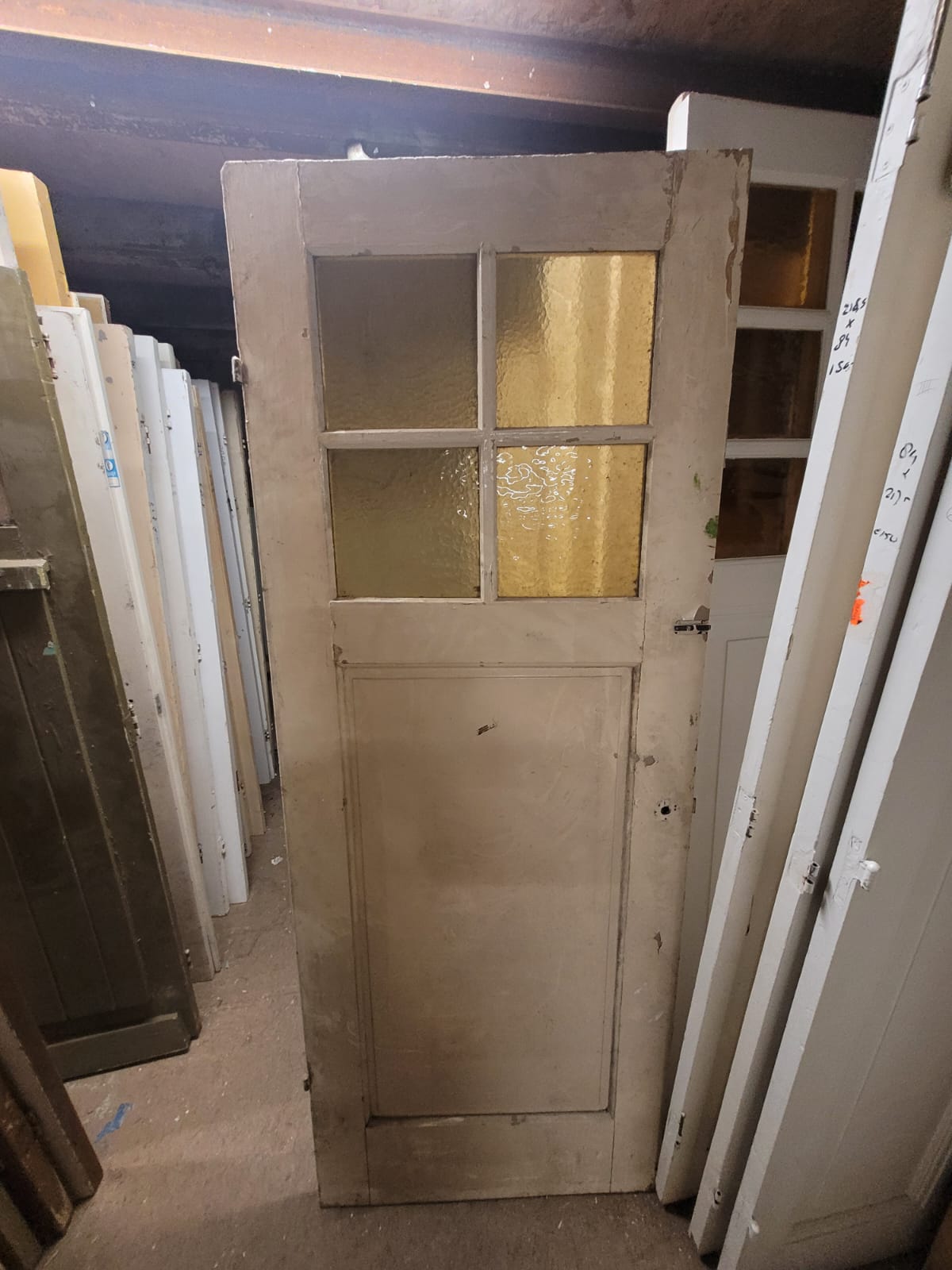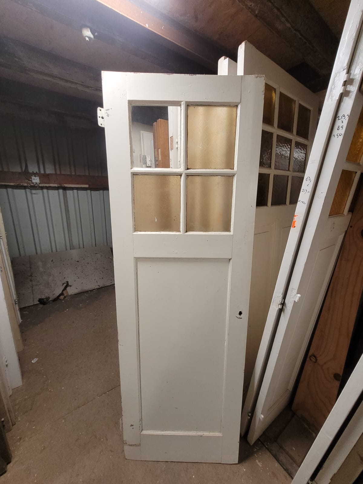 Deze deuren hebben vier glasruiten als bovenlicht en één houten paneel daaronder.