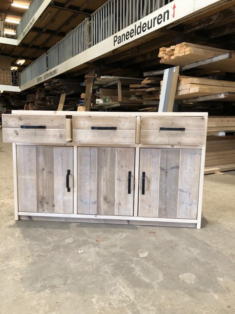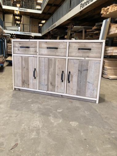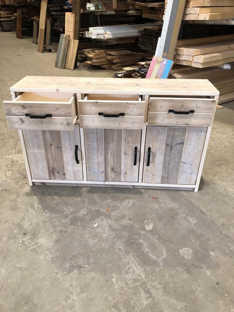 Dit handgemaakte dressoir is opgebouwd uit gebruikt steigerhout, wat zorgt voor een robuuste, karaktervolle uitstraling. Bovenin bevinden zich drie ruime lades met horizontale planken, ideaal voor kleinere spullen. Onder de lades zitten drie deuren met verticale planken, die toegang geven tot praktische opbergruimte.
