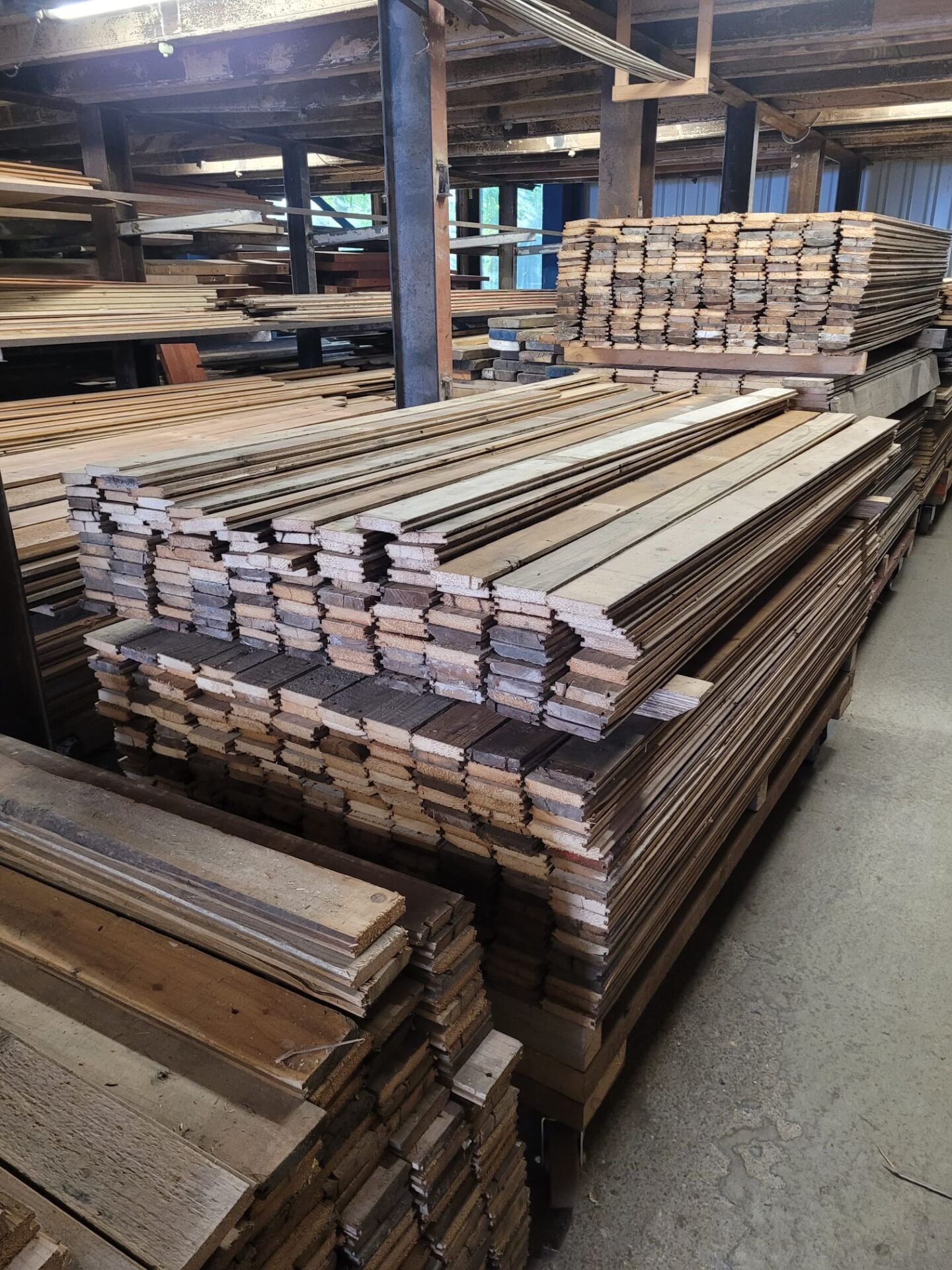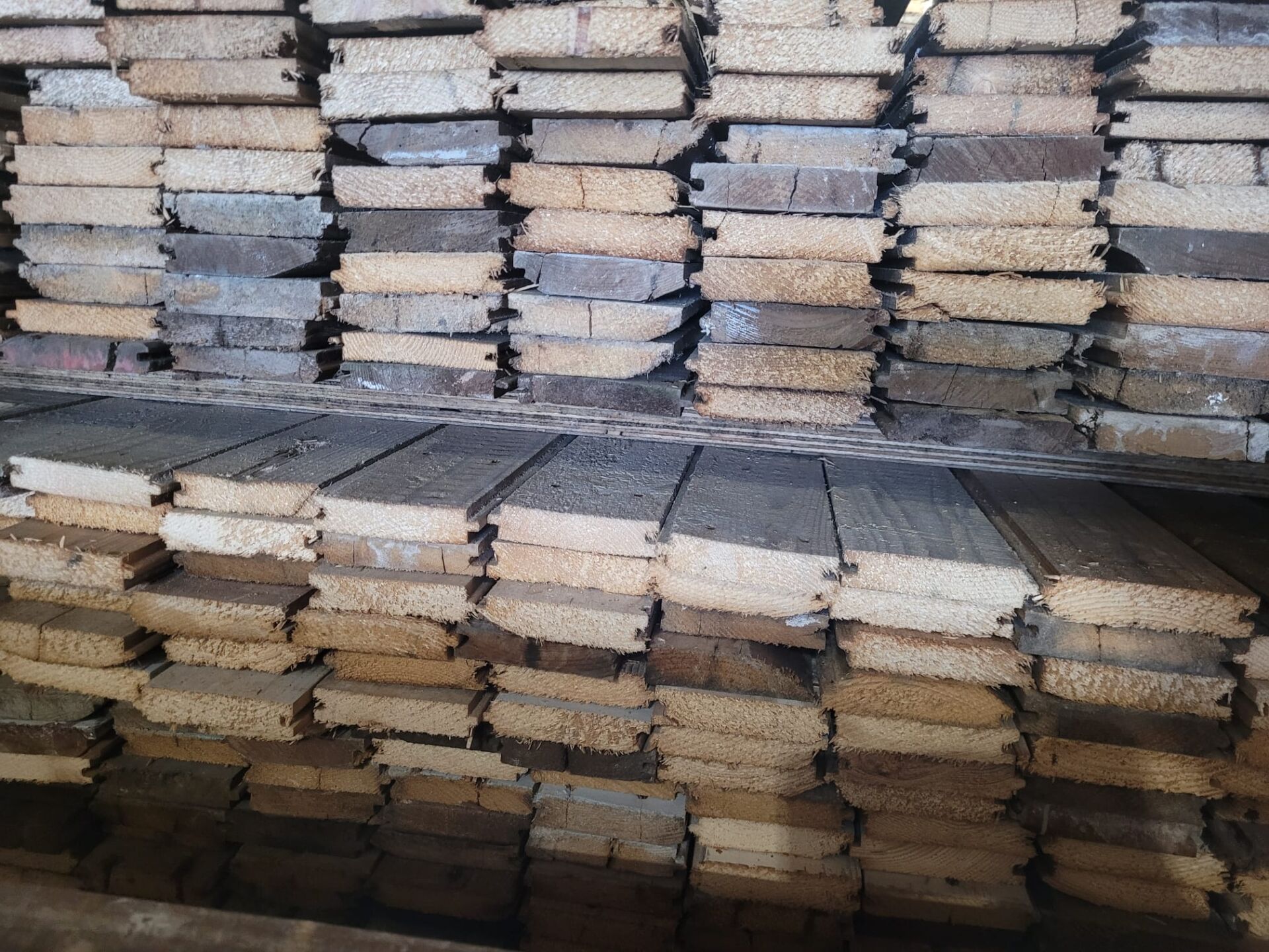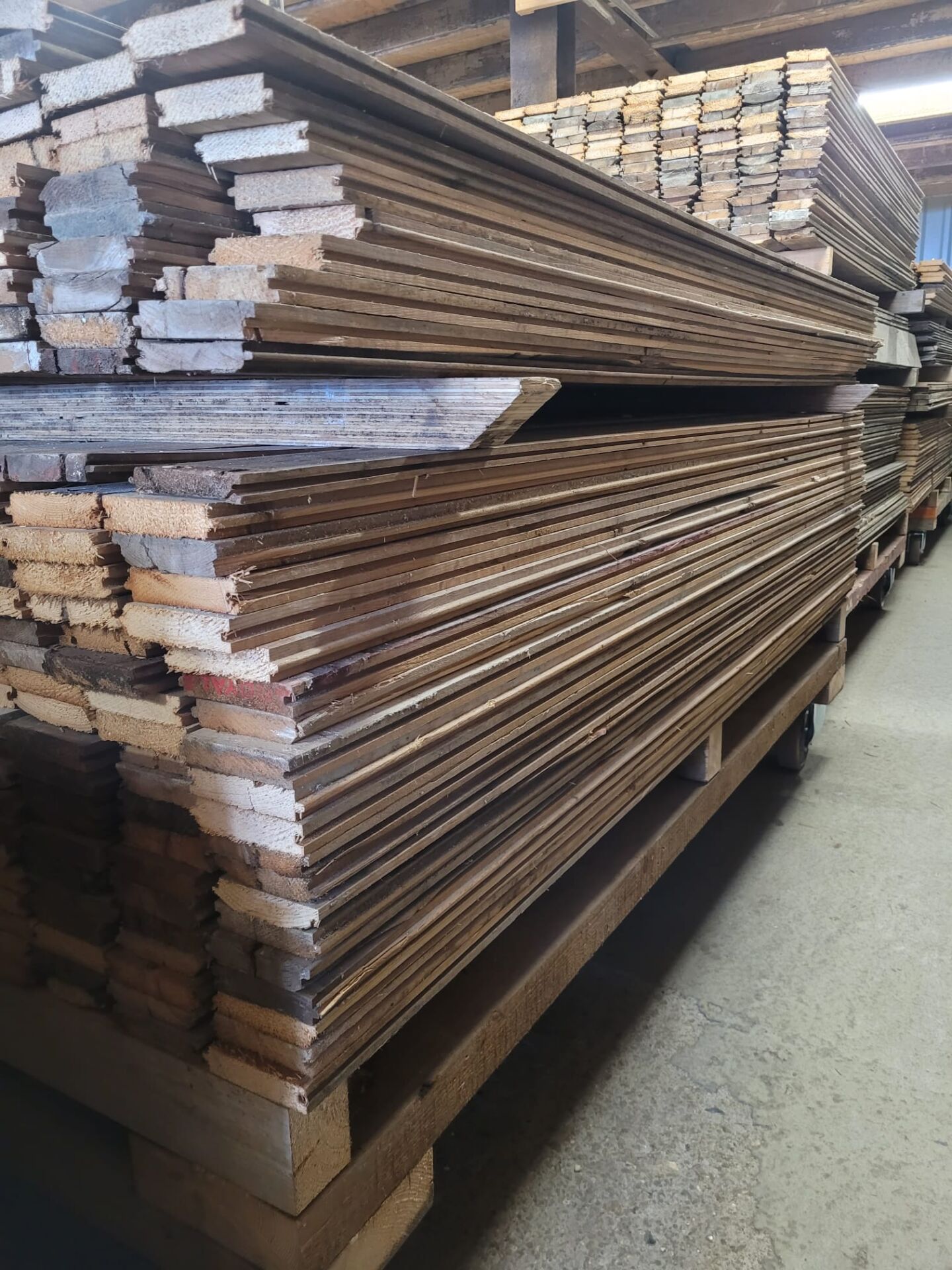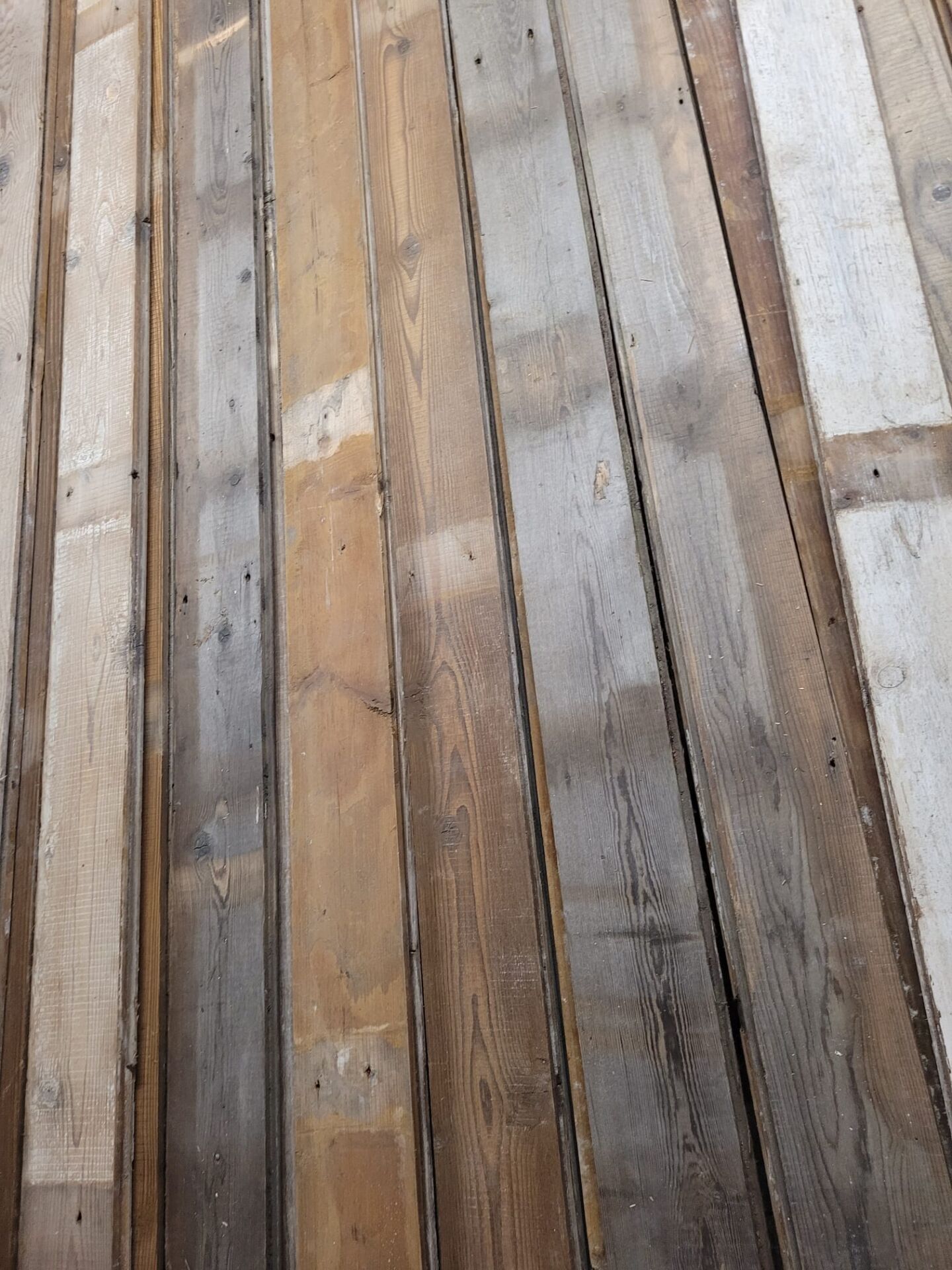 In pad 1 vind je maar liefs zes volle karren met prachtige gebruikte grenen vloerdelen, allemaal met zorg verzameld en op gelijke lengtes afgekort. Deze vloer is handmatig spijkervrij gemaakt, een intensief proces waarbij elk deel met aandacht is gecontroleerd. Toch blijft het handwerk, dus we kunnen niet met 100% zekerheid garanderen dat elk spijkertje eruit is. Hou daar rekening mee bij verwerking.