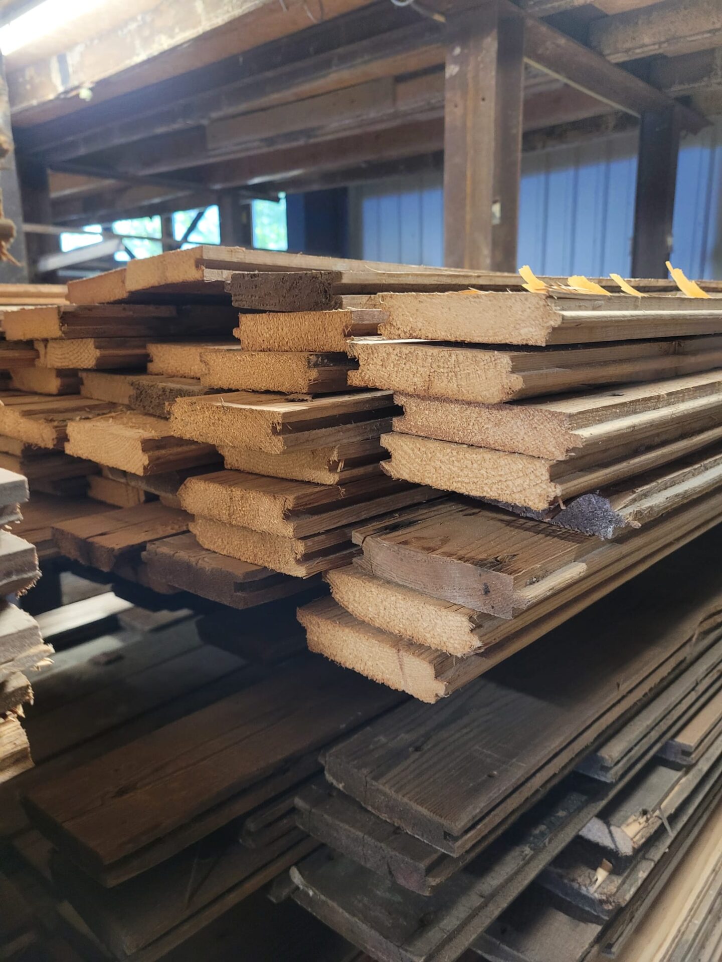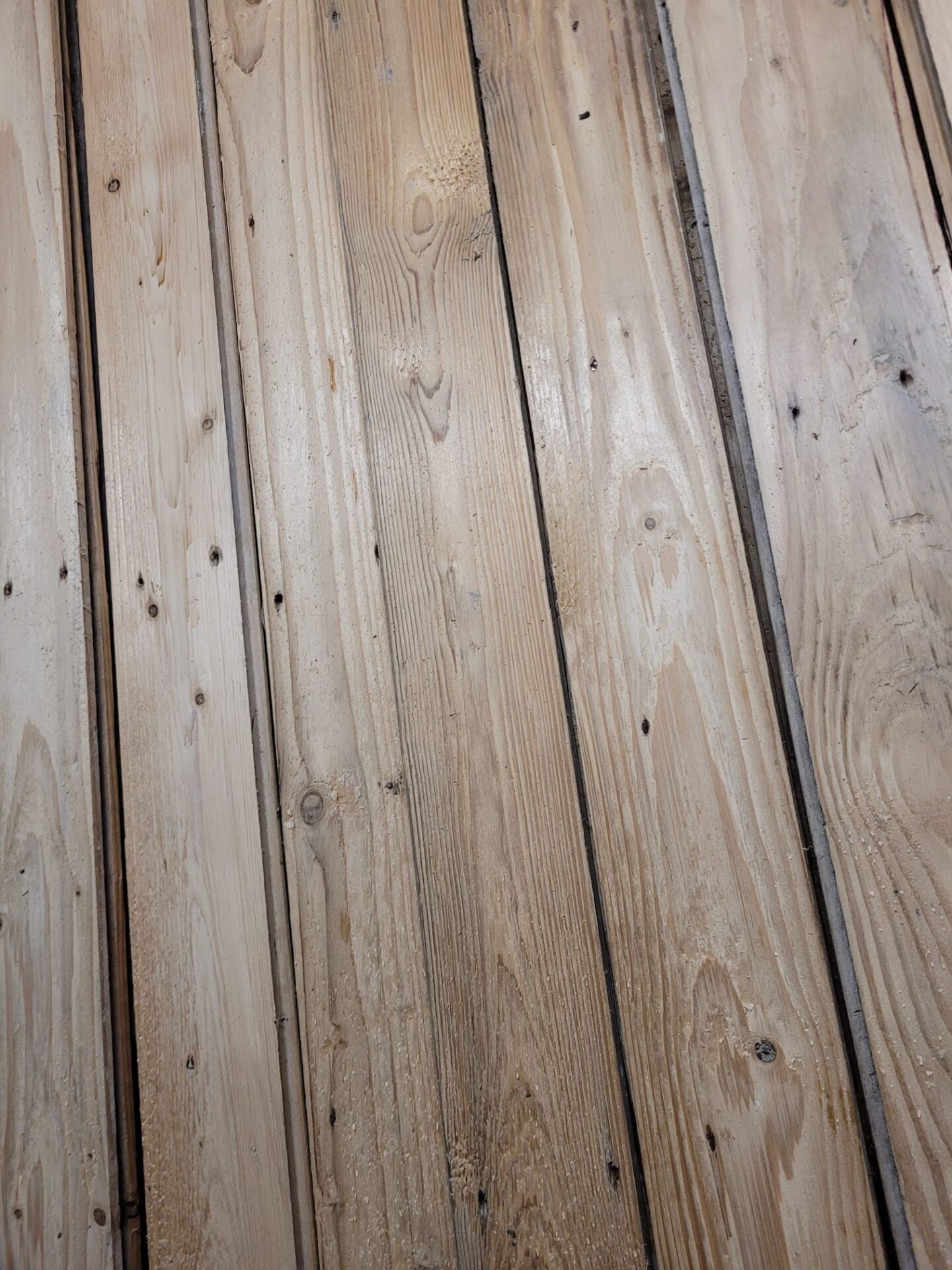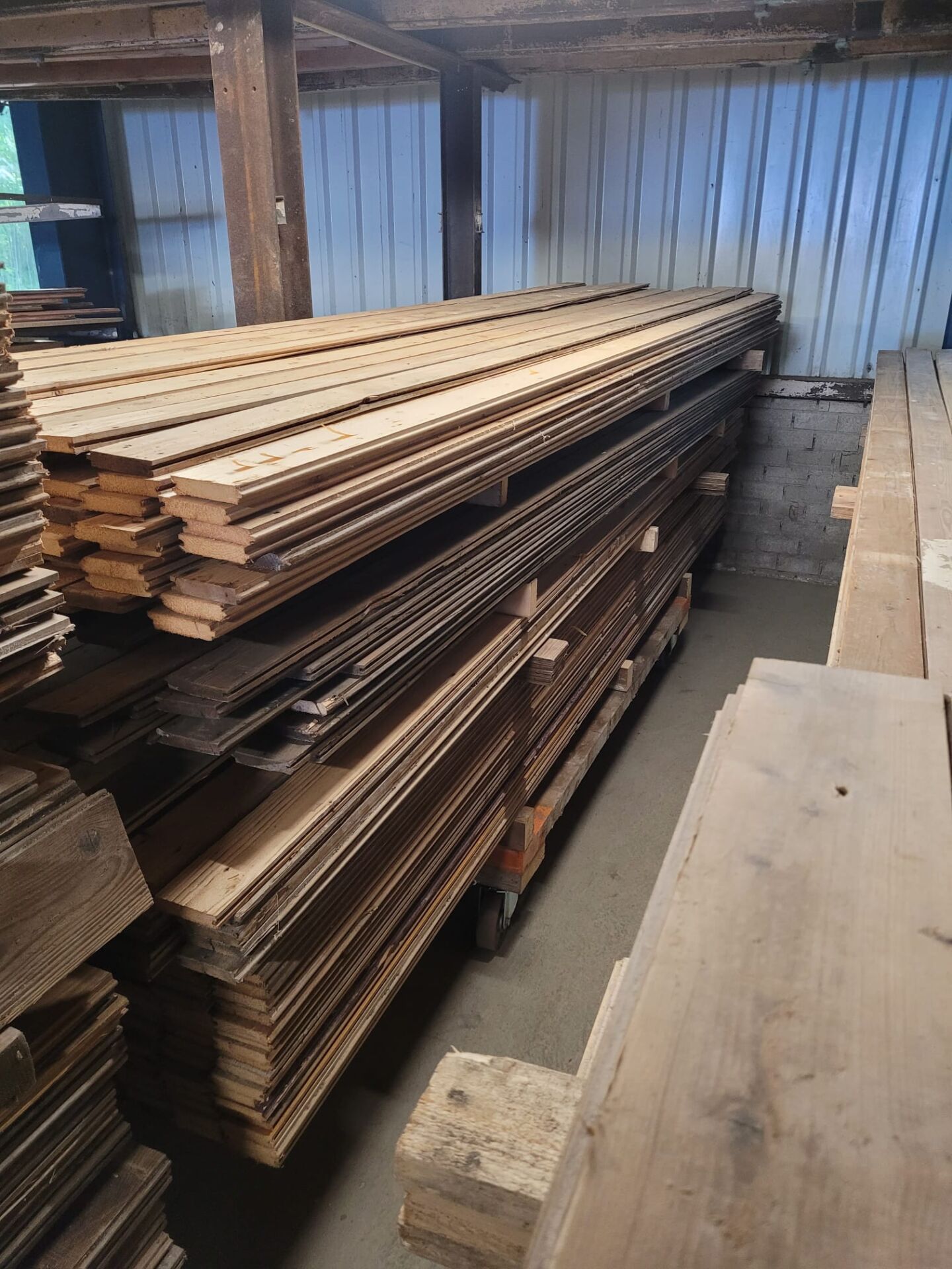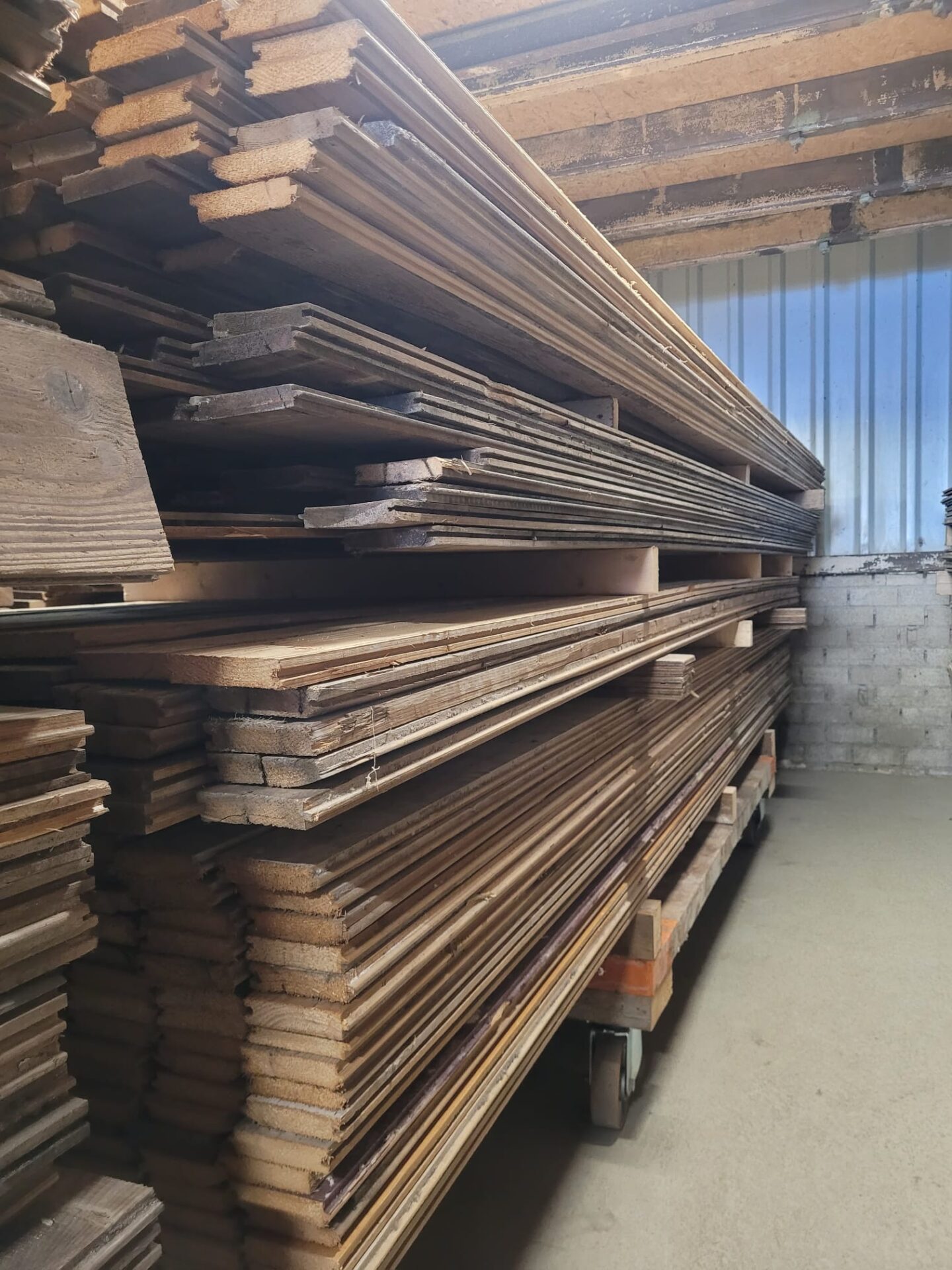 In Pad 1 vind je maar liefst zes volle karren met prachtige gebruikte grenen vloerdelen, allemaal met zorg verzameld en op gelijke lengtes afgekort. Deze vloer is handmatig spijkervrij gemaakt – een intensief proces waarbij elk deel met aandacht is gecontroleerd. Toch blijft het handwerk, dus we kunnen niet met 100% zekerheid garanderen dat elk spijkertje eruit is. Hou daar rekening mee bij verwerking.