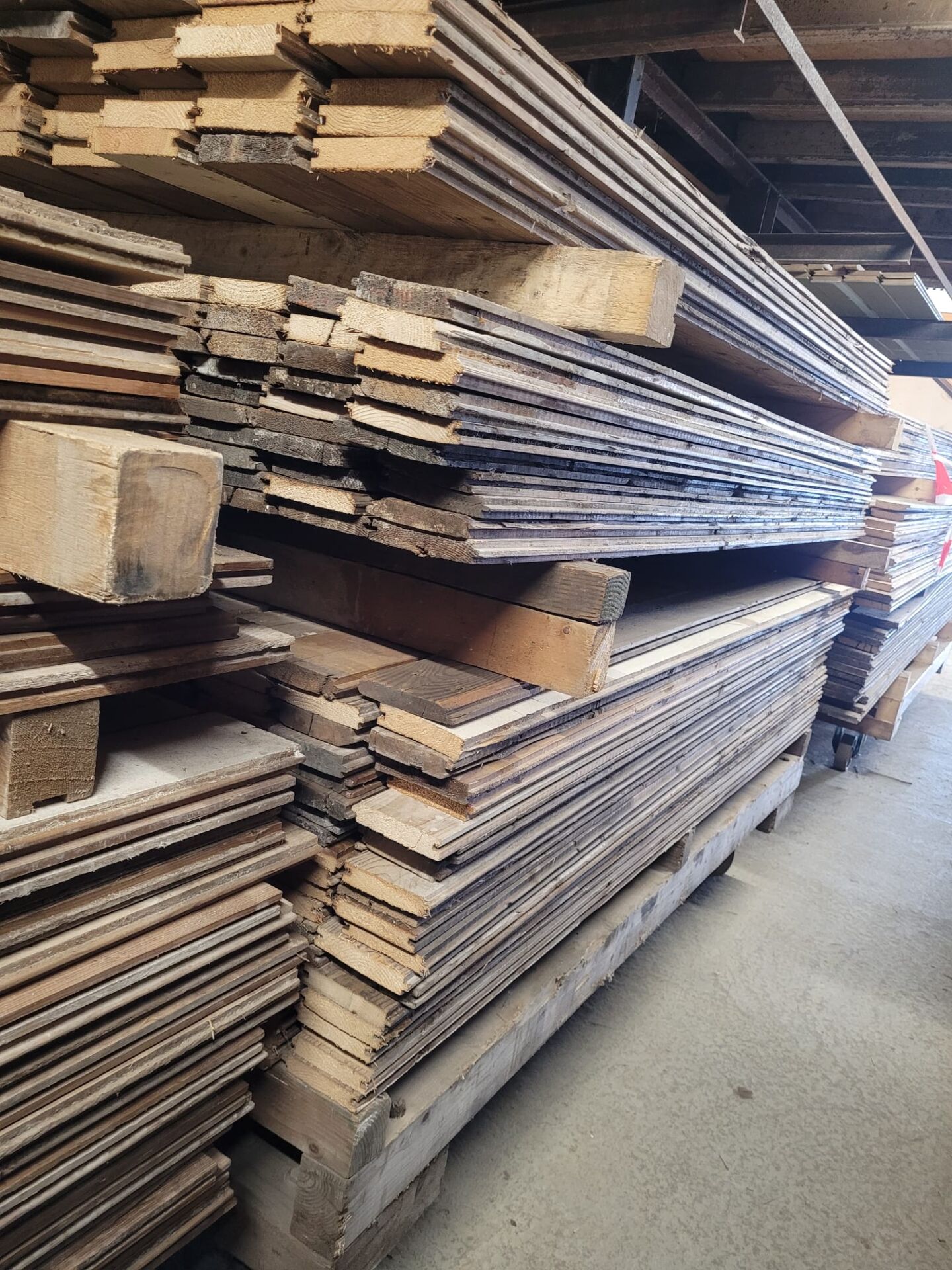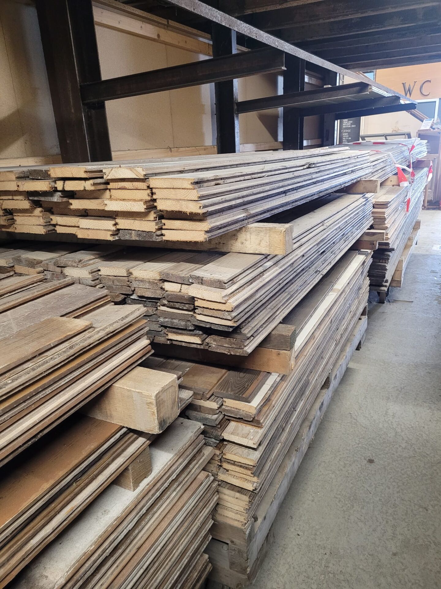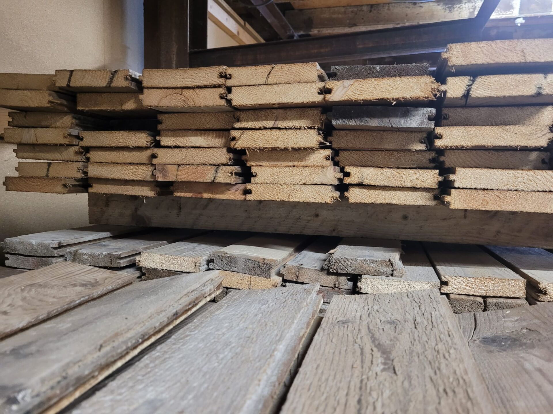 In Pad 1 vind je maar liefst zes volle karren met prachtige gebruikte grenen vloerdelen, allemaal met zorg verzameld en op gelijke lengtes afgekort. Deze vloer is handmatig spijkervrij gemaakt – een intensief proces waarbij elk deel met aandacht is gecontroleerd. Toch blijft het handwerk, dus we kunnen niet met 100% zekerheid garanderen dat elk spijkertje eruit is. Hou daar rekening mee bij verwerking.