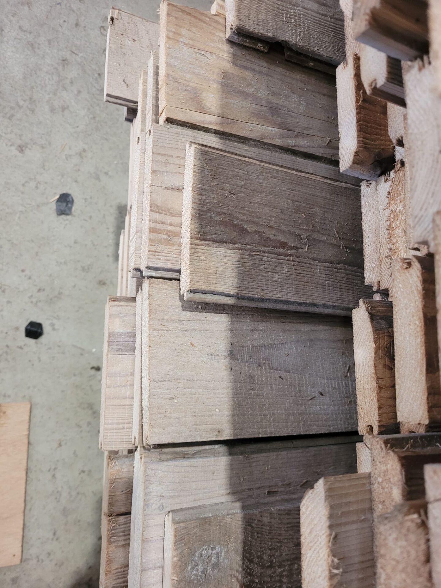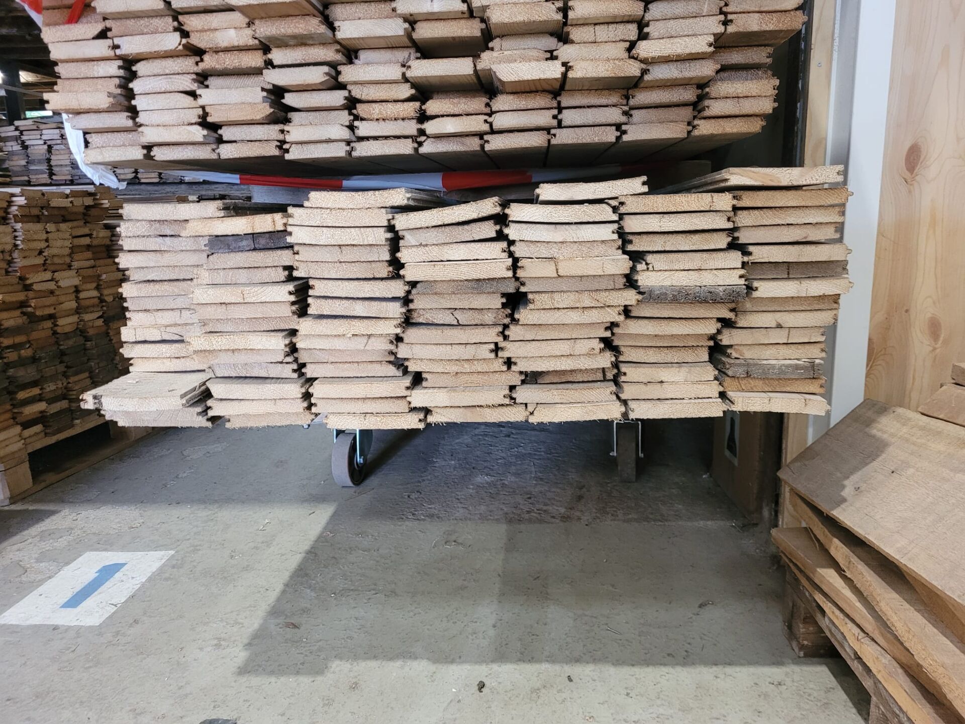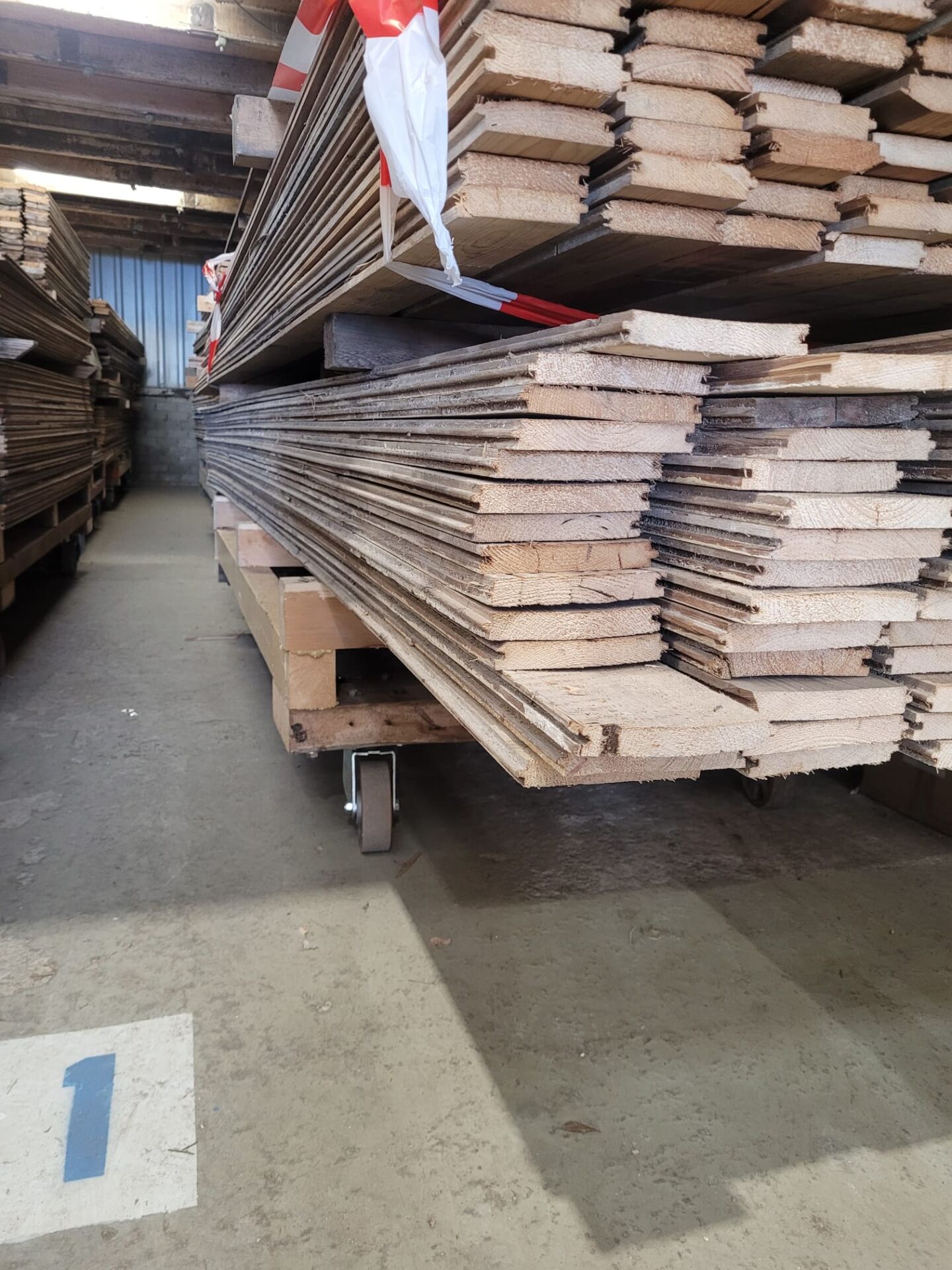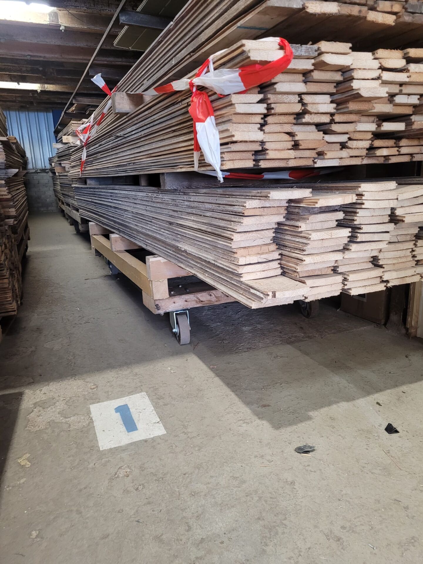 In Pad 1 vind je maar liefst zes volle karren met prachtige gebruikte grenen vloerdelen, allemaal met zorg verzameld en op gelijke lengtes afgekort. Deze vloer is handmatig spijkervrij gemaakt – een intensief proces waarbij elk deel met aandacht is gecontroleerd. Toch blijft het handwerk, dus we kunnen niet met 100% zekerheid garanderen dat elk spijkertje eruit is. Hou daar rekening mee bij verwerking.