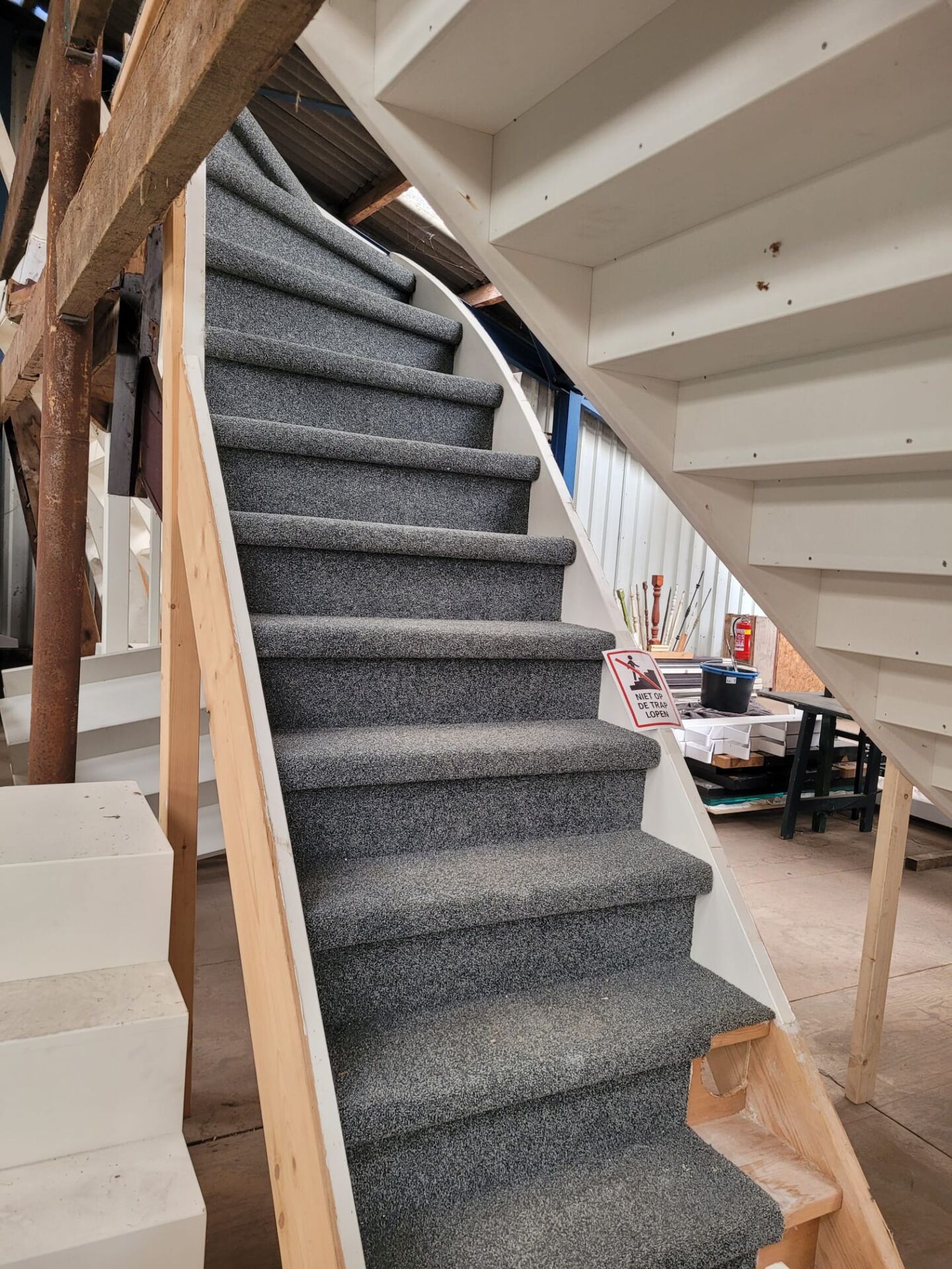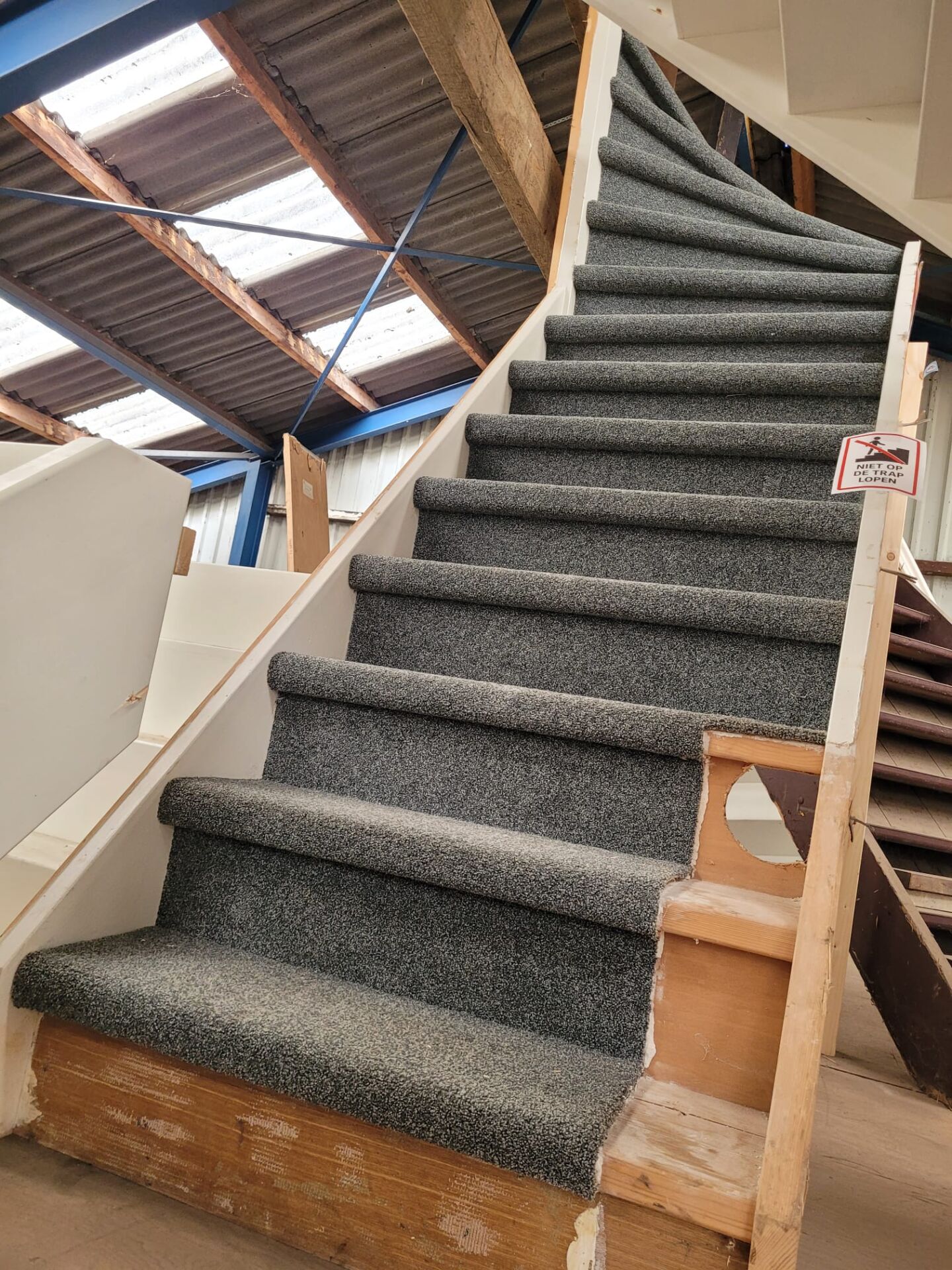 Deze rechte trap is bekleed met een zacht grijs tapijt dat zorgt voor comfort en grip. Aan het einde van de trap zit een vloeiende bocht naar links, ideaal voor een stijlvolle overgang naar een bovenverdieping.