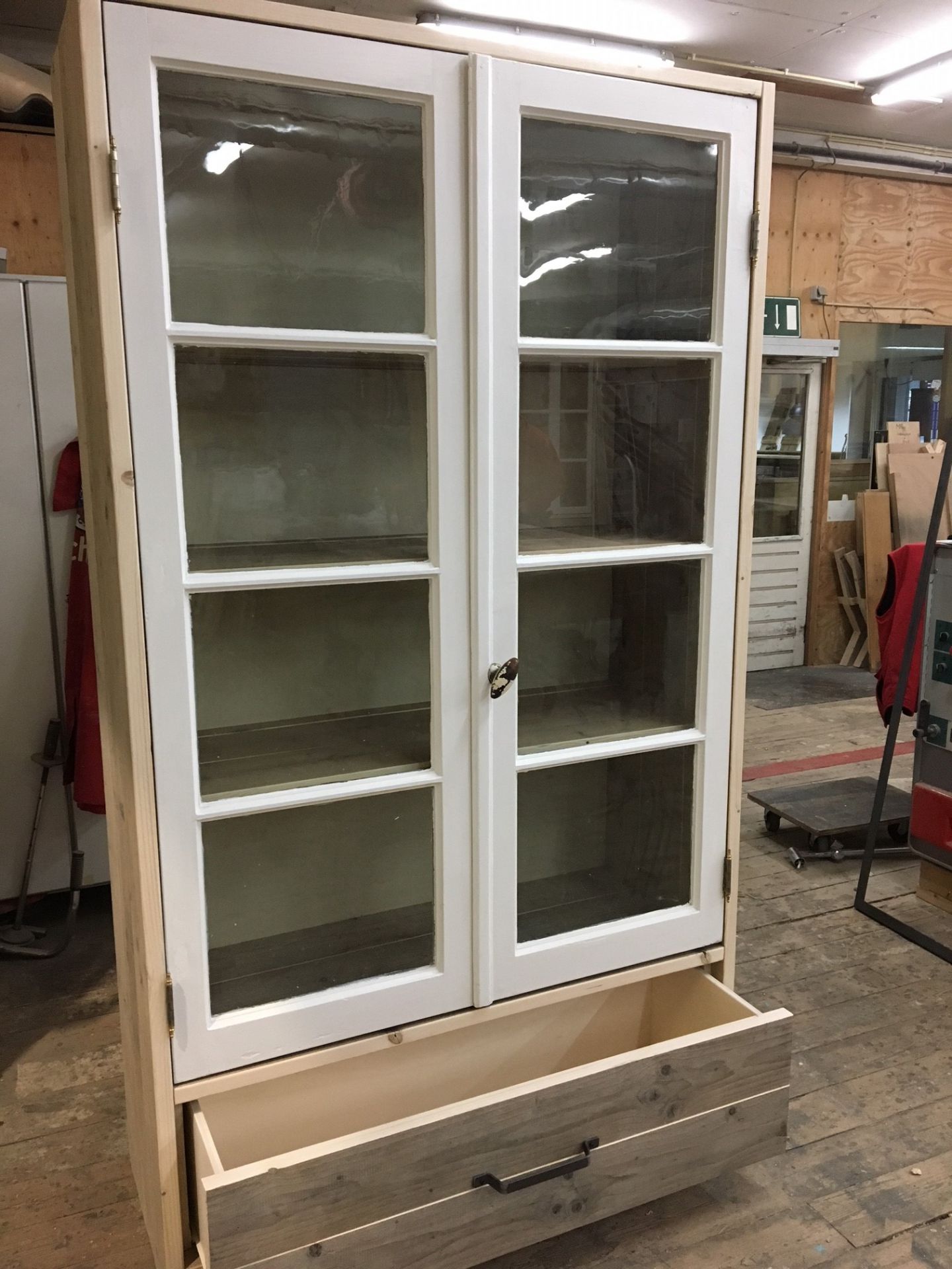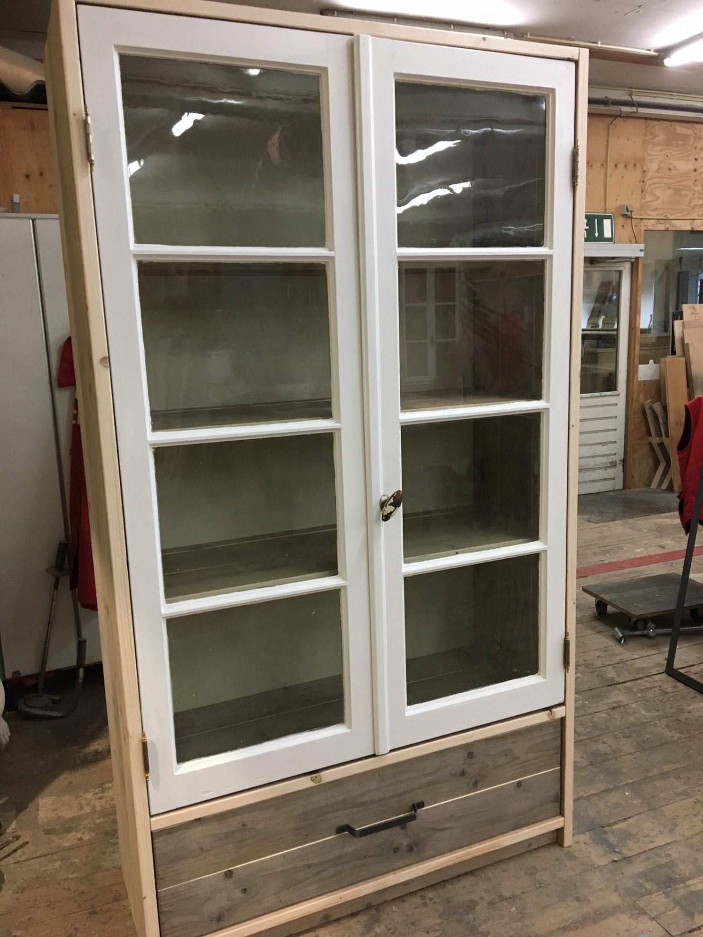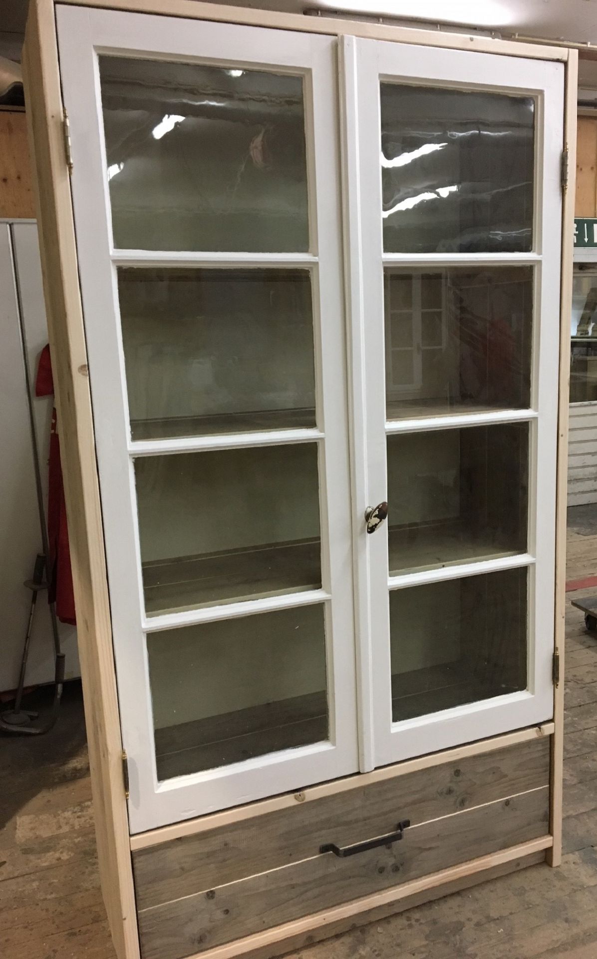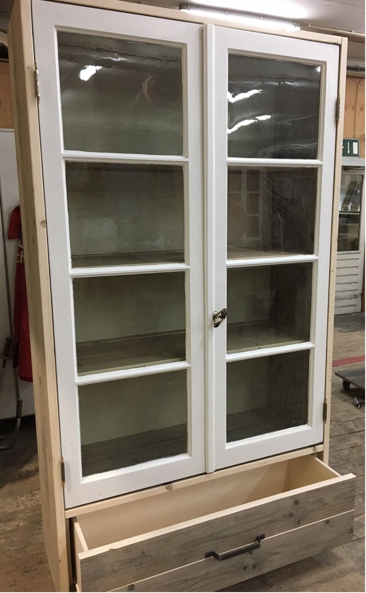 Deze bijzondere kast is opgebouwd met twee authentieke oude ramen als deuren, waardoor het een charmant en karaktervol uiterlijk krijgt. Onder de glazen bovenkast bevinden zich robuuste lade, gemaakt van gebruikt steigerhout of jouw eigen gekozen houtsoort.