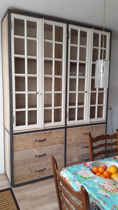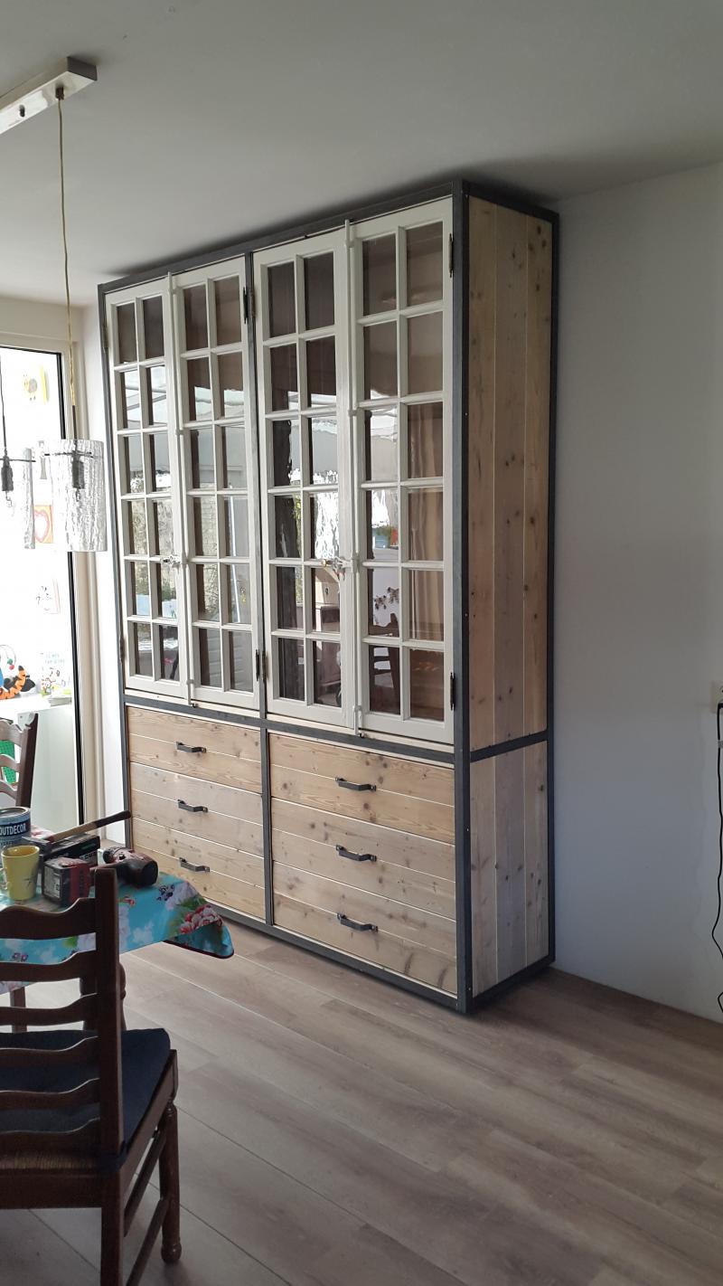 Deze bijzondere kast is opgebouwd met twee authentieke oude ramen als deuren, waardoor het een charmant en karaktervol uiterlijk krijgt. Onder de glazen bovenkast bevinden zich robuuste lades, gemaakt van gebruikt steigerhout of jouw eigen gekozen houtsoort.