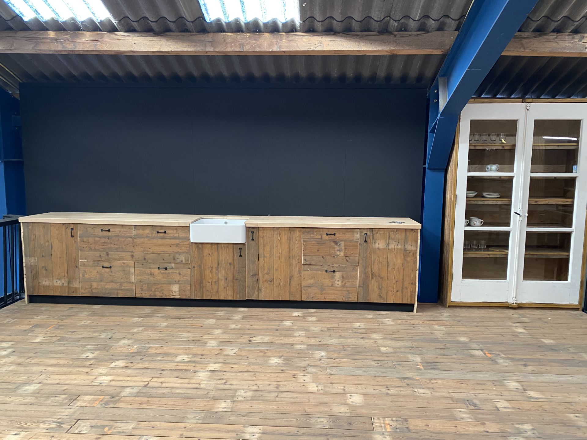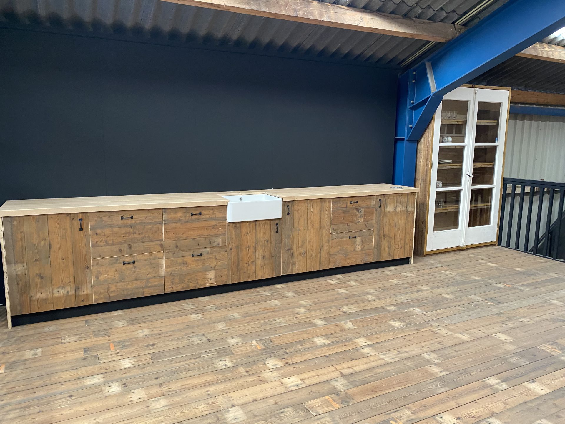 De keuken is voorzien van een diepe, vierkante wasbak die zowel functioneel als stijlvol is. De oude grepen maken het geheel af en geven een authentieke, tijdloze sfeer aan het meubel.