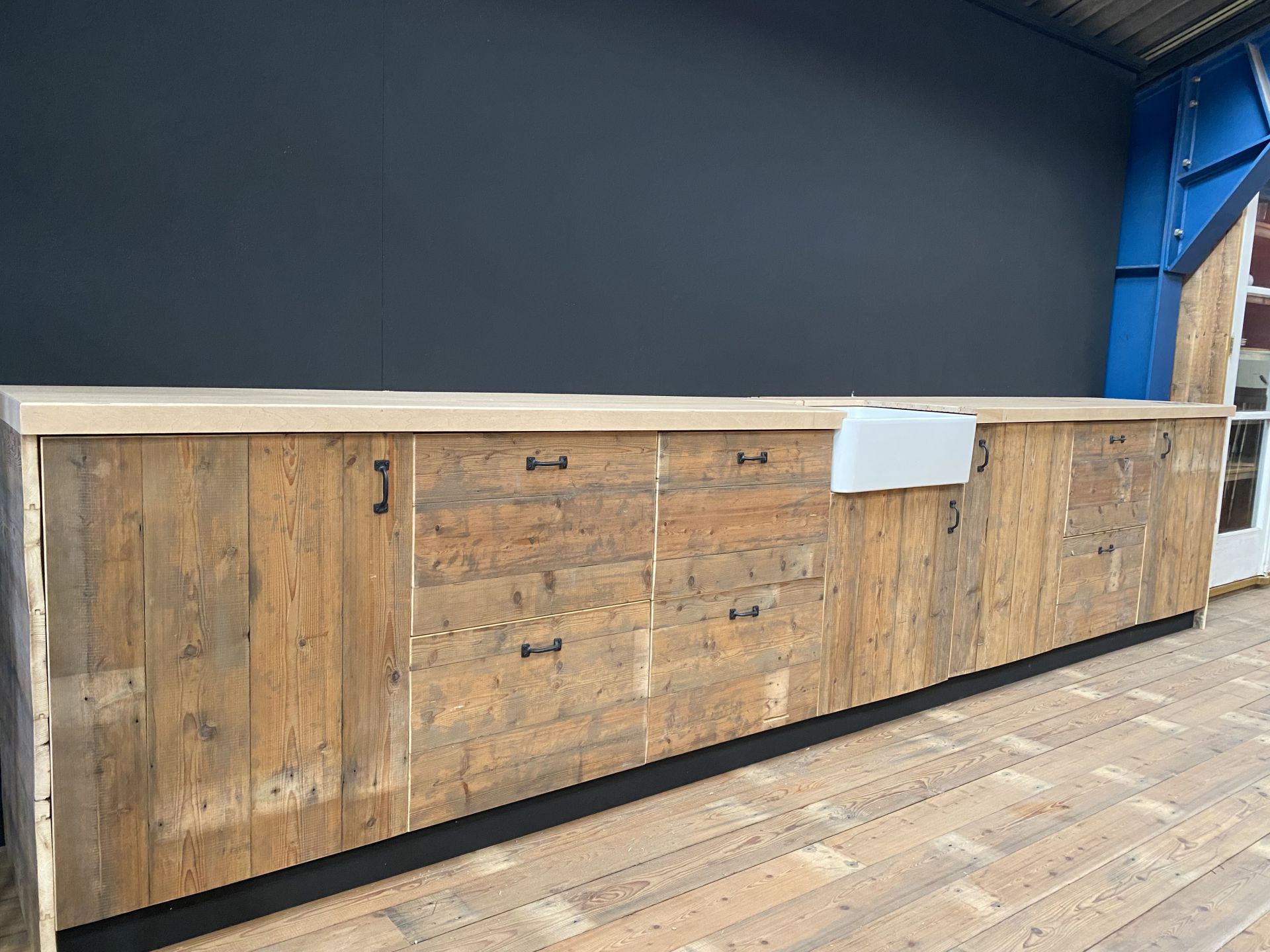 Deze handgemaakte keuken is een prachtig voorbeeld van vakwerk met karakter. Het werkblad is gemaakt van een oud gymzaalvloerblad – een stoer en duurzaam materiaal dat meteen een verhaal vertelt. De frontjes van de lades en kastdeuren zijn uitgevoerd in massief grenenhout, zorgvuldig geschuurd en afgewerkt voor een warme, natuurlijke uitstraling.