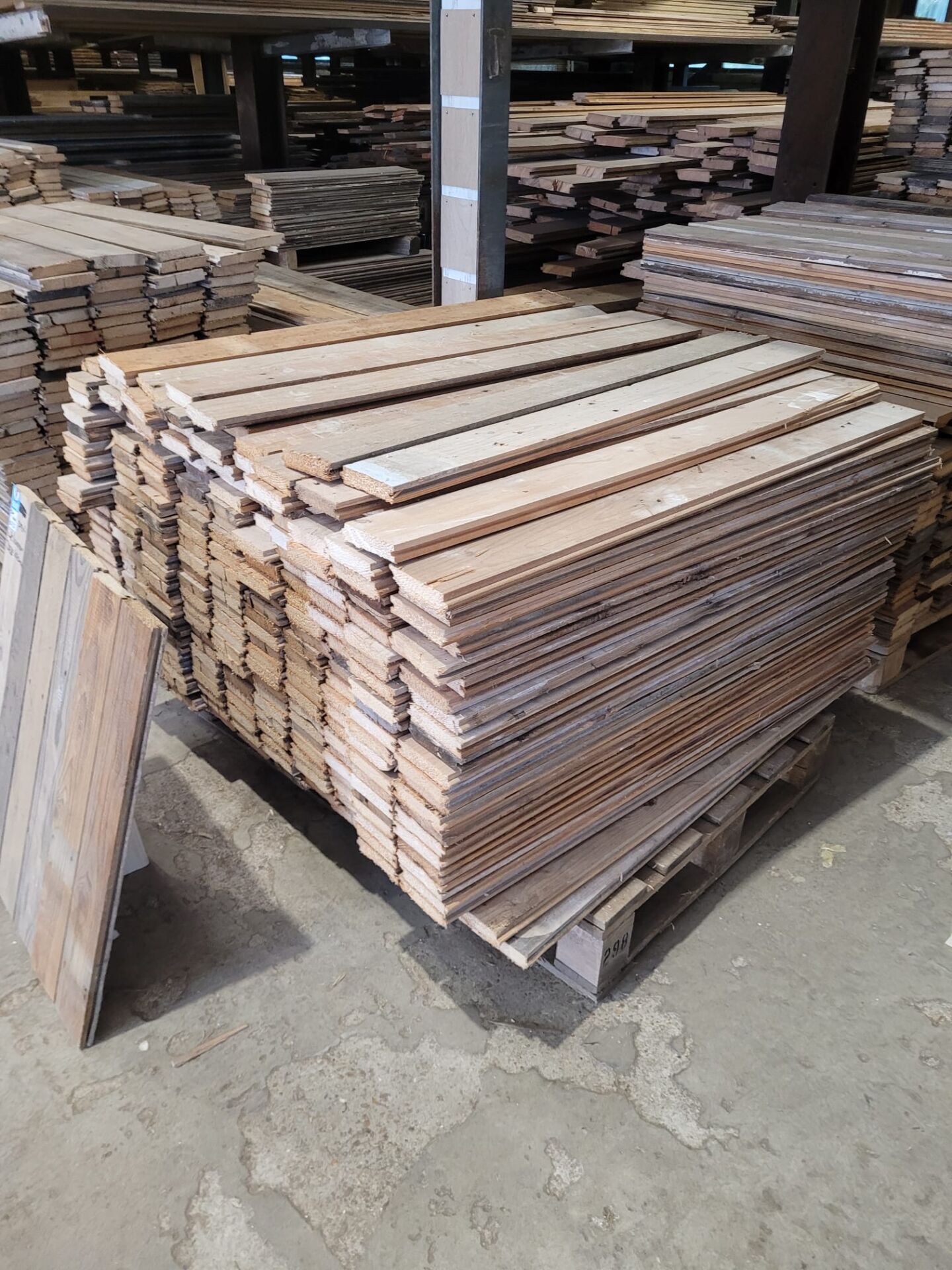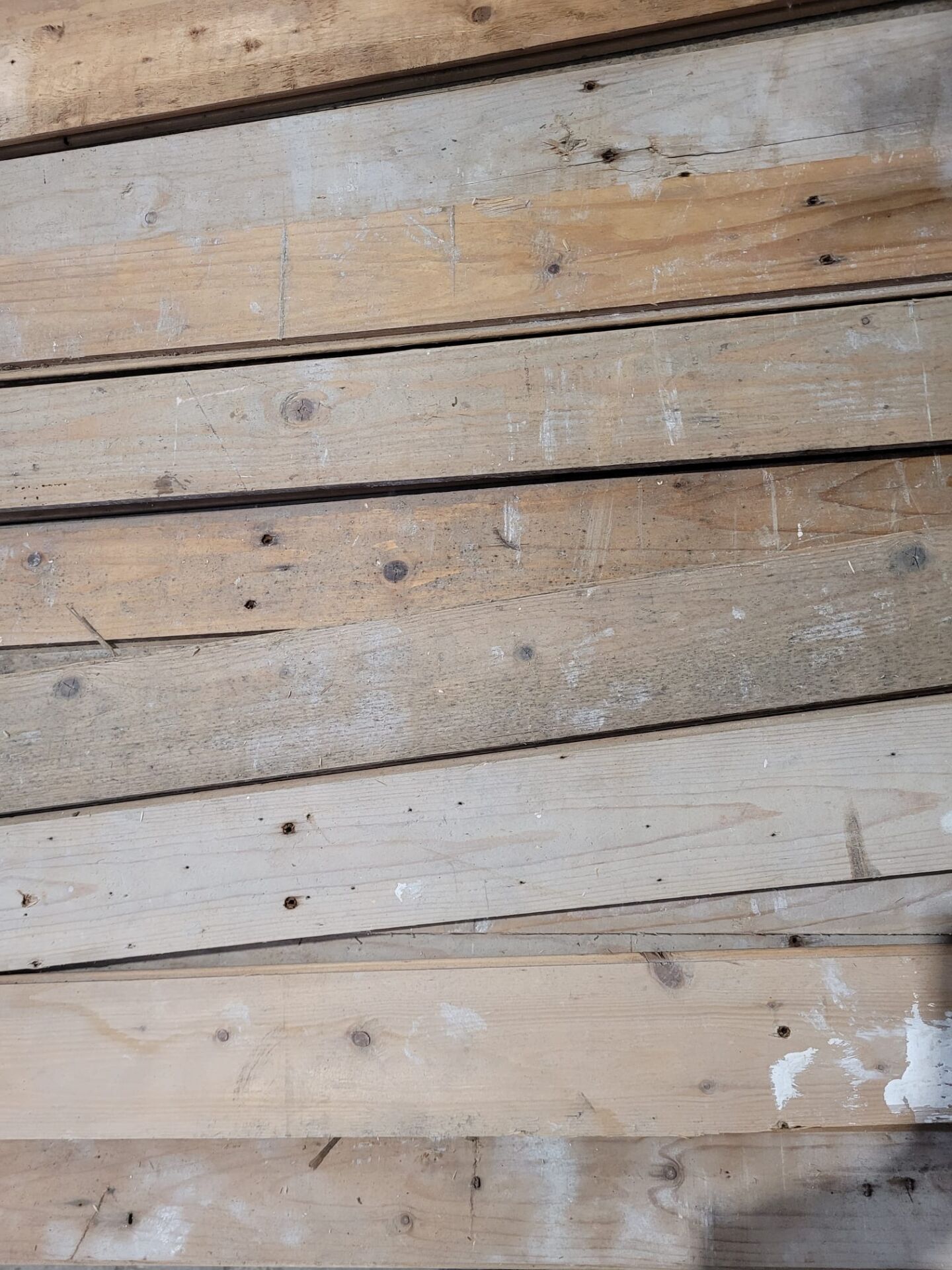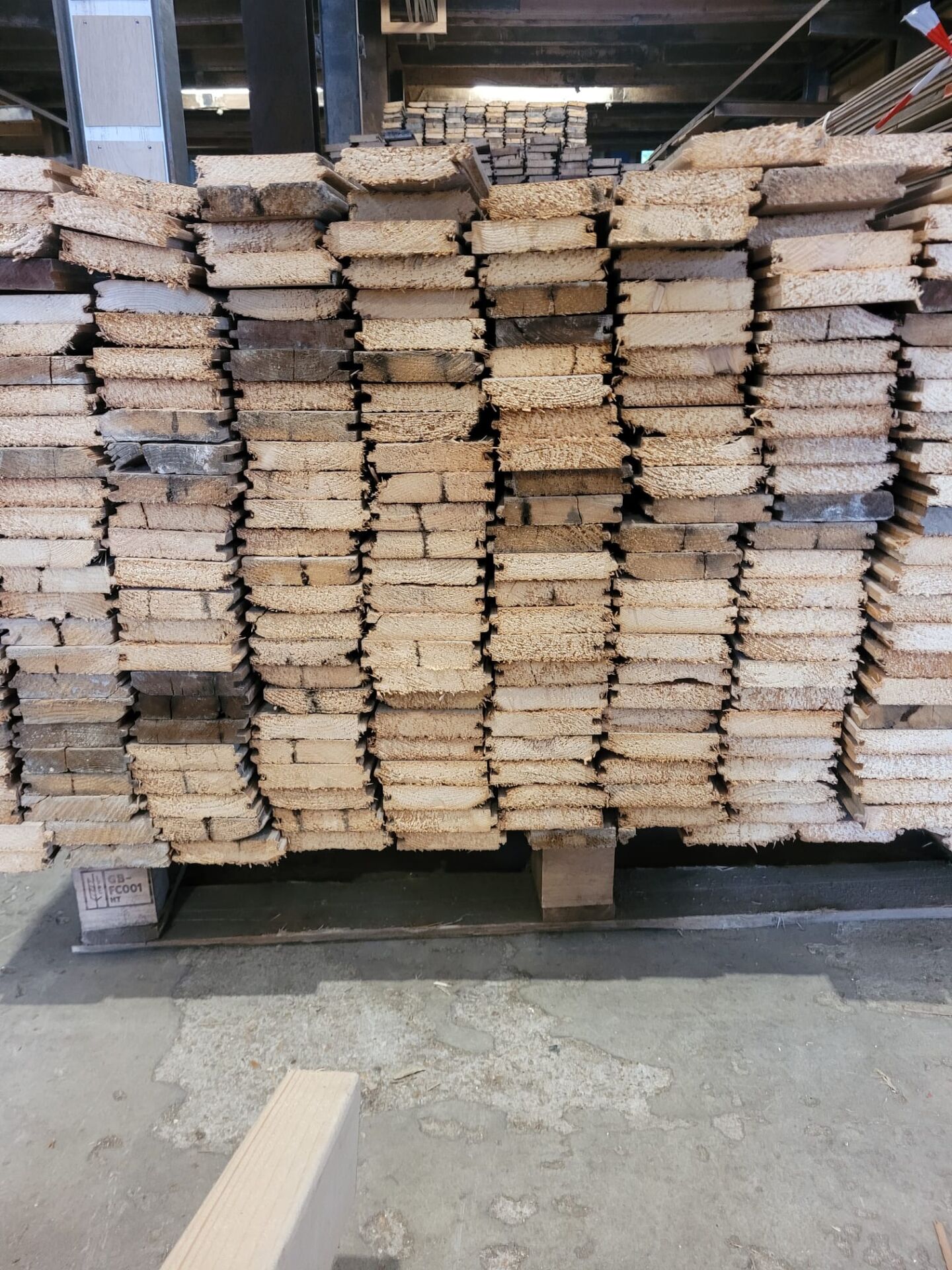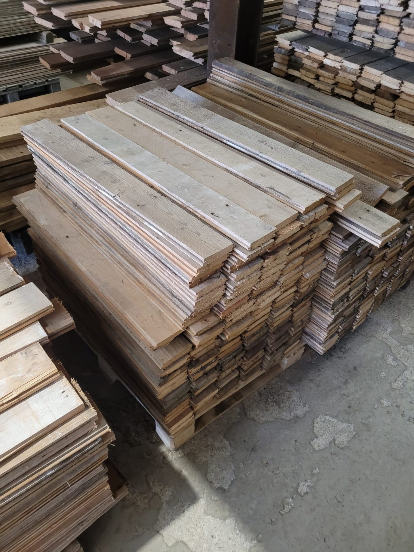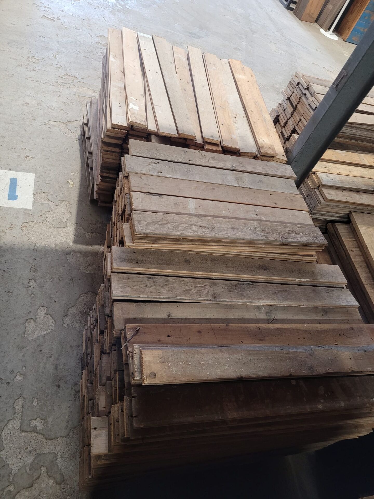 In pad 1 vind je maar liefs zes volle karren met prachtige gebruikte grenen vloerdelen, allemaal met zorg verzameld en op gelijke lengtes afgekort. Deze vloer is handmatig spijkervrij gemaakt, een intensief proces waarbij elk deel met aandacht is gecontroleerd. Toch blijft het handwerk, dus we kunnen niet met 100% zekerheid garanderen dat elk spijkertje eruit is. Hou daar rekening mee bij verwerking.