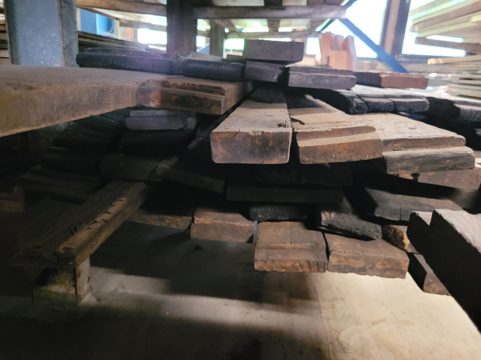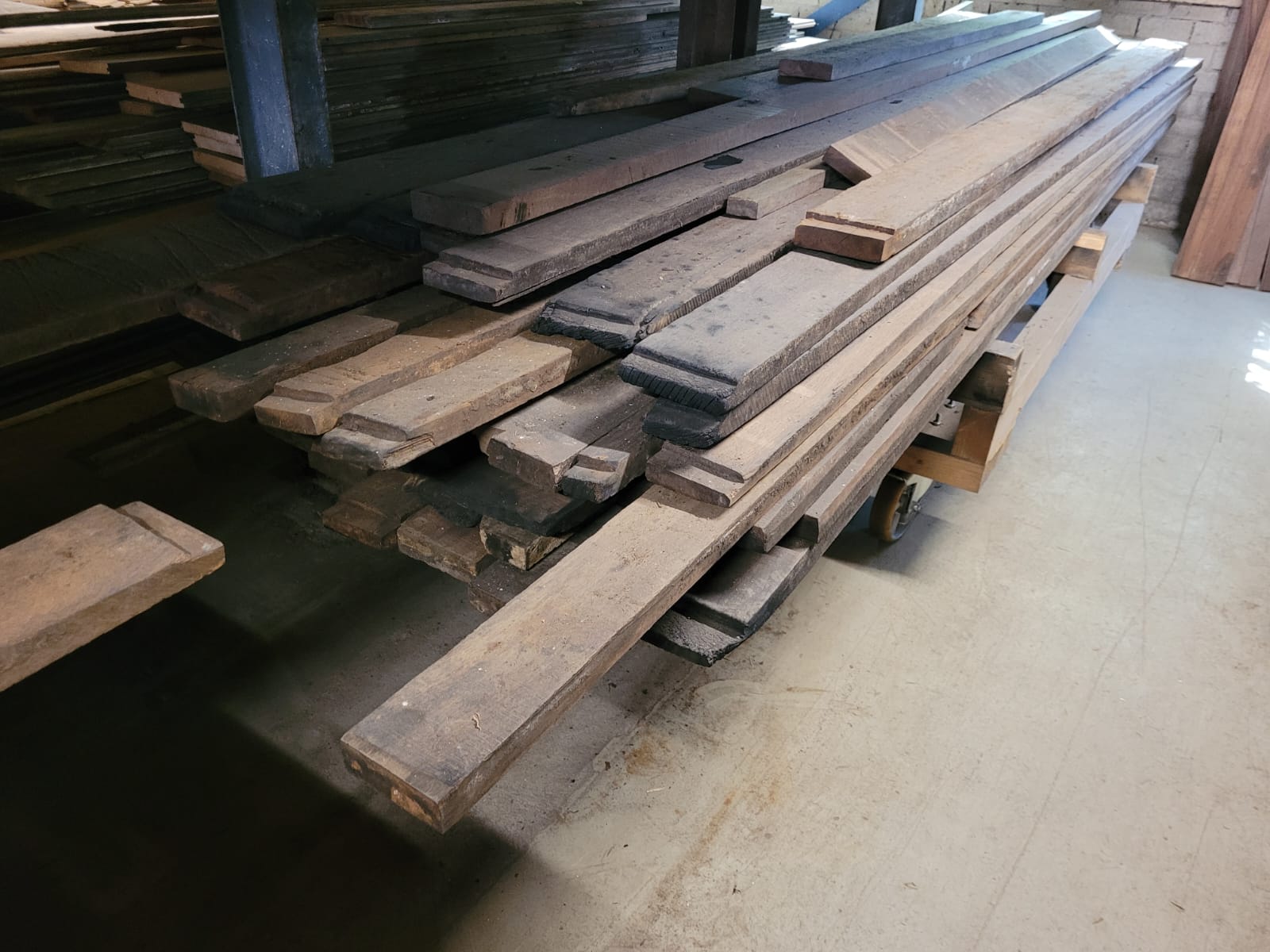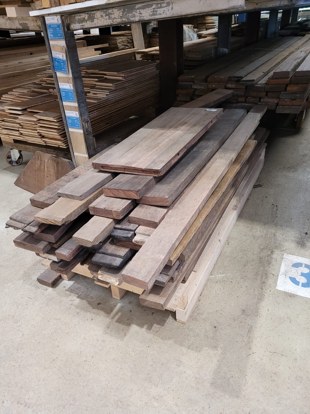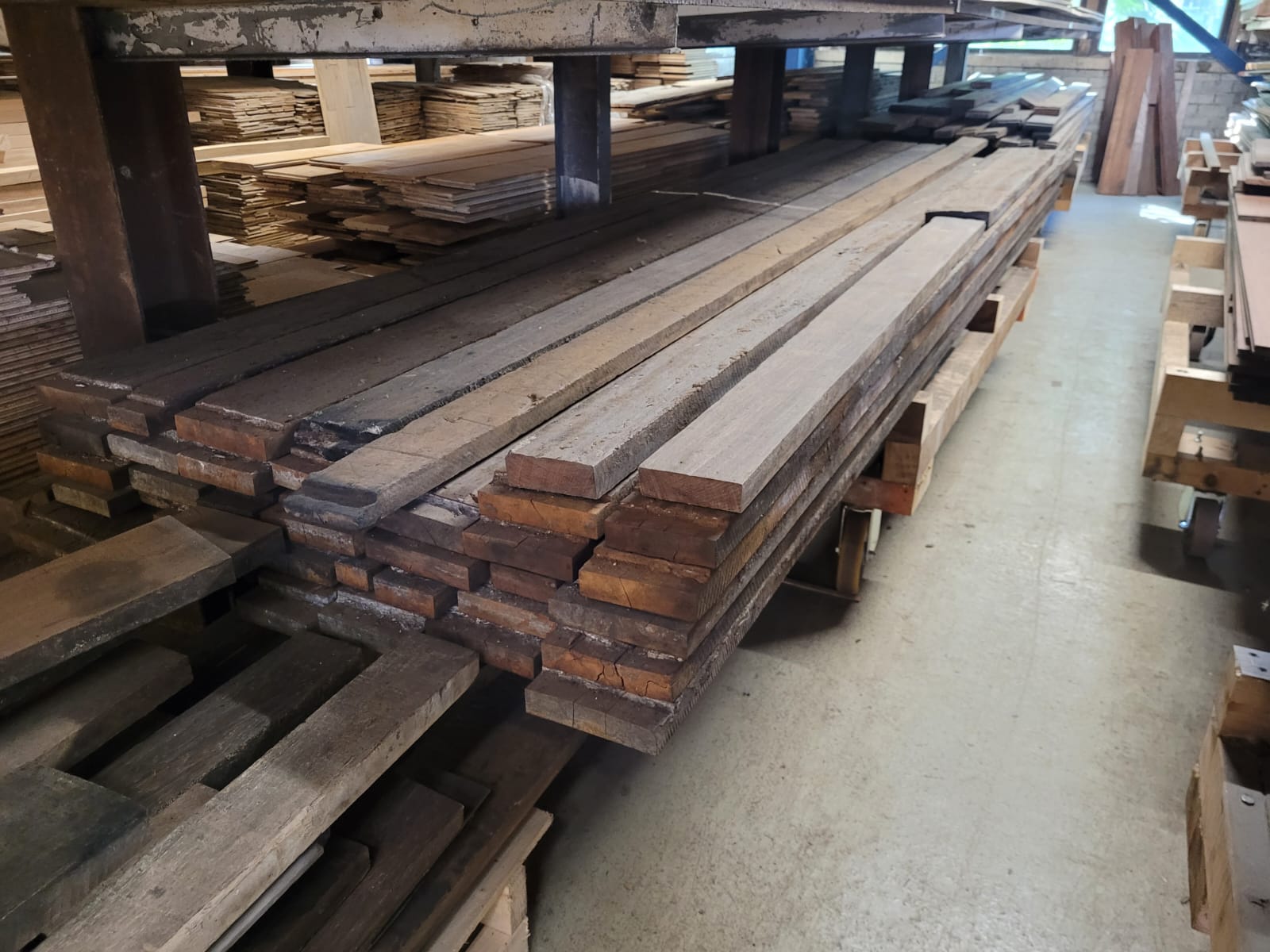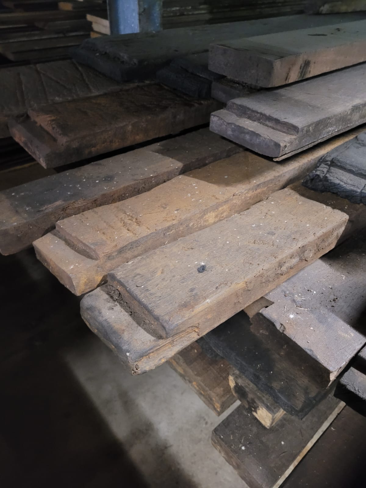 Massieve planken van scheepshouten wengé, vol karakter en geschiedenis. De planken zijn gemiddeld 4 meter lang en 4 cm dik, met breedtes die variëren tussen de 9 en 15 cm.