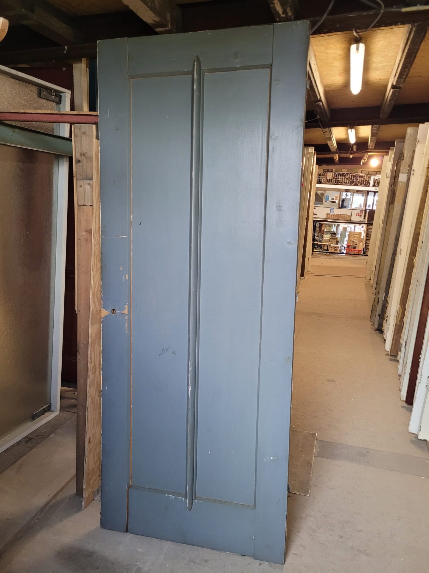 In onze gangpad 12 hebben we 8 bijzondere deuren die afkomstig zijn uit een oude monumentenwinkel. Deze deuren hebben een éénvlak ontwerp met een sierlat in het midden, waardoor het lijkt alsof er twee vlakken zijn. Aan beide zijden is het uiterlijk identiek.