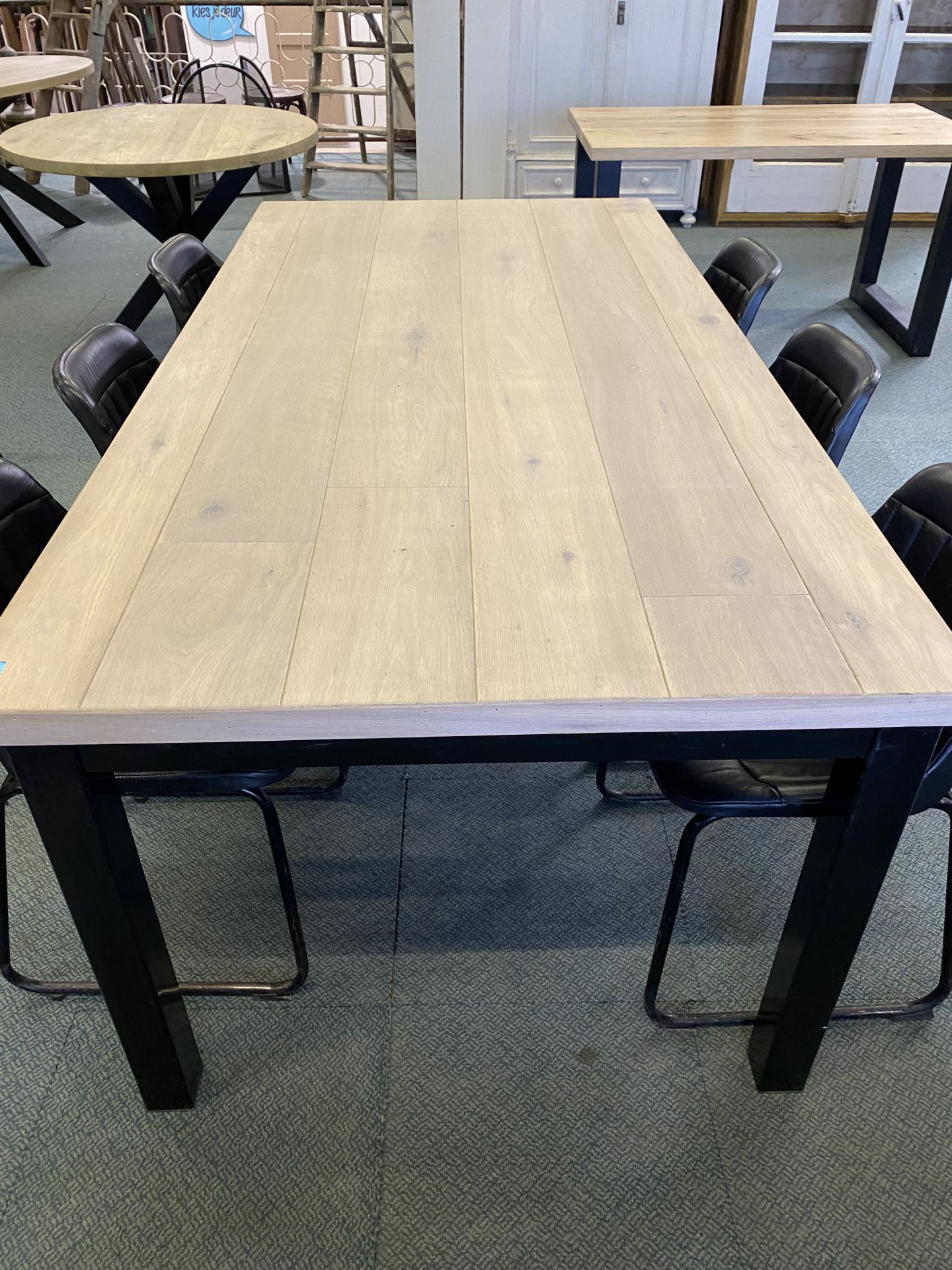 Deze tafel combineert de warme uitstraling van authentieke eiken vloerdelen met een stoer zwart stalen onderstel, versterkt door stevige regels voor extra stabiliteit. Het tafelblad bestaat uit zorgvuldig geselecteerde vloerdelen met een prachtig doorleefde uitstraling en karakteristieke houtnerven, waardoor elke tafel uniek is.