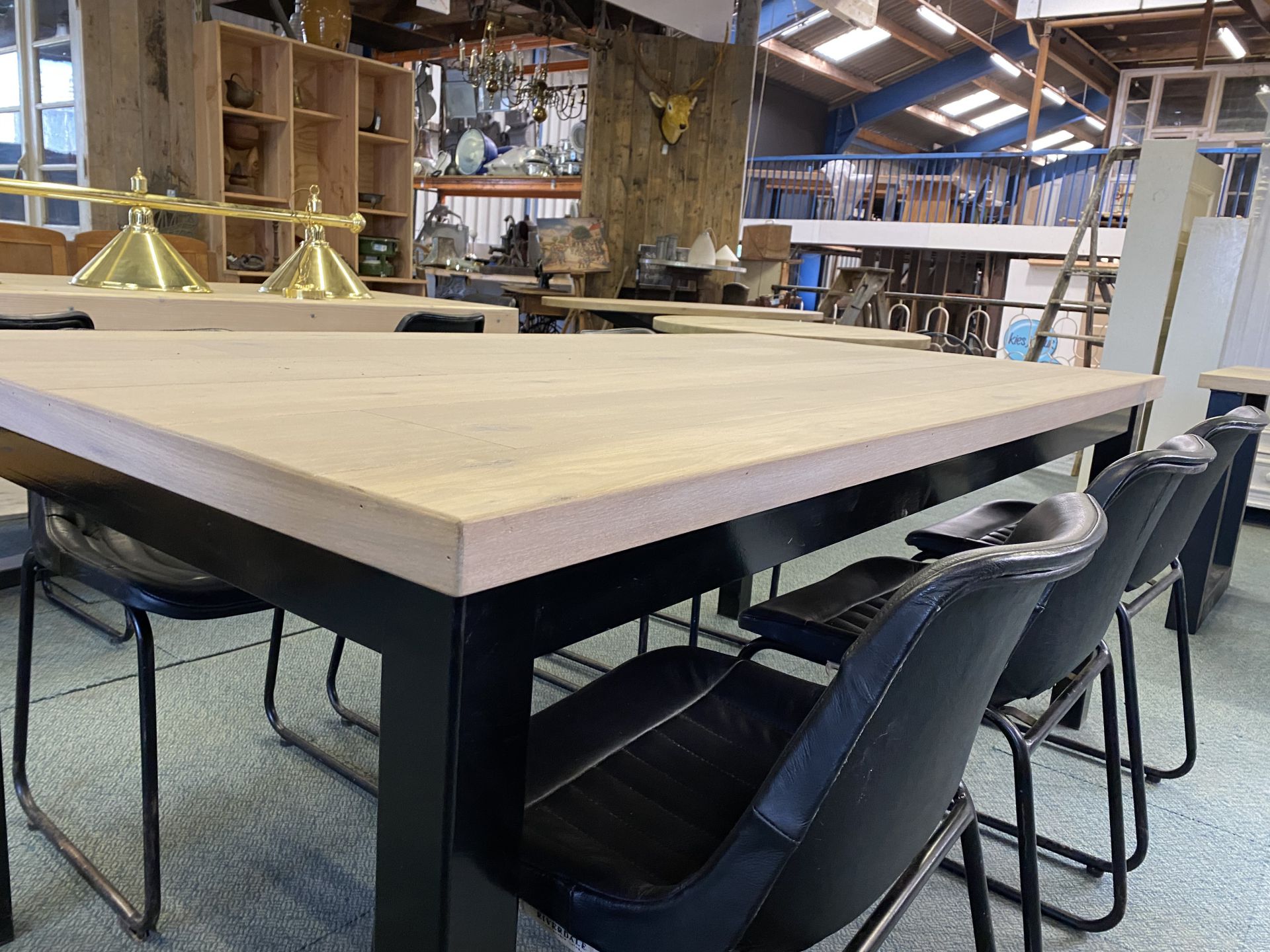 Het zwarte stalen onderstel met extra regels zorgt niet alleen voor een robuuste, industriële look, maar ook voor een zeer stevige constructie die jarenlang meegaat. Ideaal voor gebruik als eettafel, werkplek of vergadertafel in zowel huiselijke als zakelijke omgevingen.