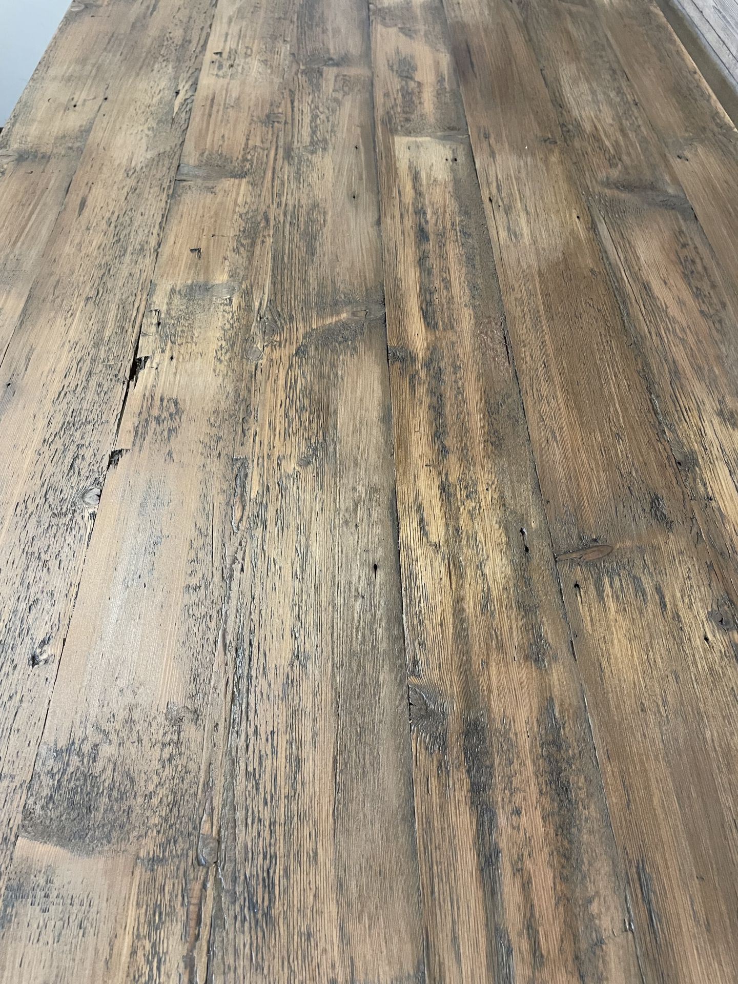 Deze tafel is gemaakt van iets bijzonders: de oude kerkvloer uit een kerk in Den Helder. Elke plank draagt sporen van tientallen jaren geschiedenis, met een doorleefde uitstraling die je niet kunt namaken. Denk aan diepe nerven, subtiele verkleuringen, slijtageplekken en hier en daar een verfrestje — puur karakter.